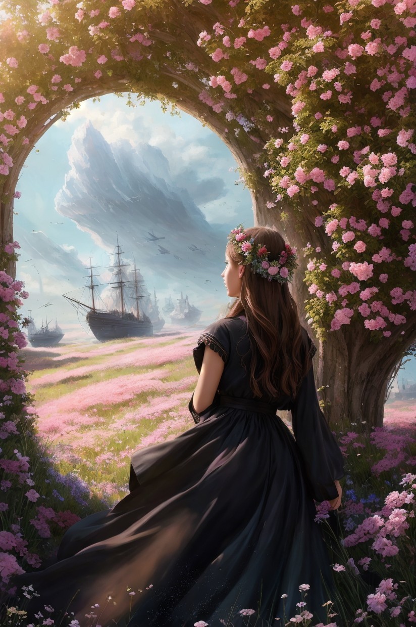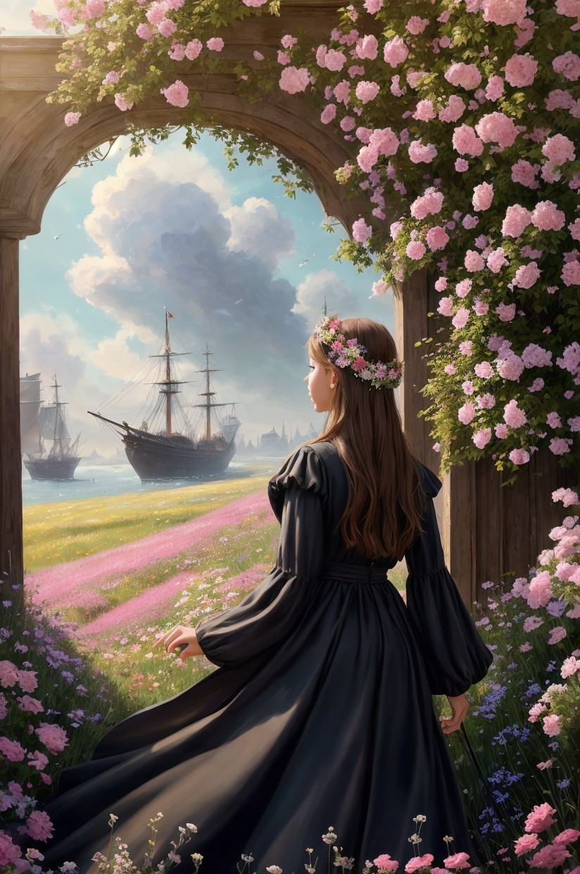 (painting of girl from behind looking a fleet of imperial ships in the sky, in a meadow of flowers.)