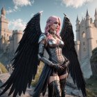The image features a woman with pink, curly hair and elaborate tattoos, adorned with delicate wings, standing against a backdrop of a mystical castle and vibrant mountains at sunset.