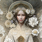 A stunning portrait of a woman adorned in a colorful, floral headdress and elaborate attire. Her expression exudes grace, surrounded by vibrant blooms and intricate gold details.