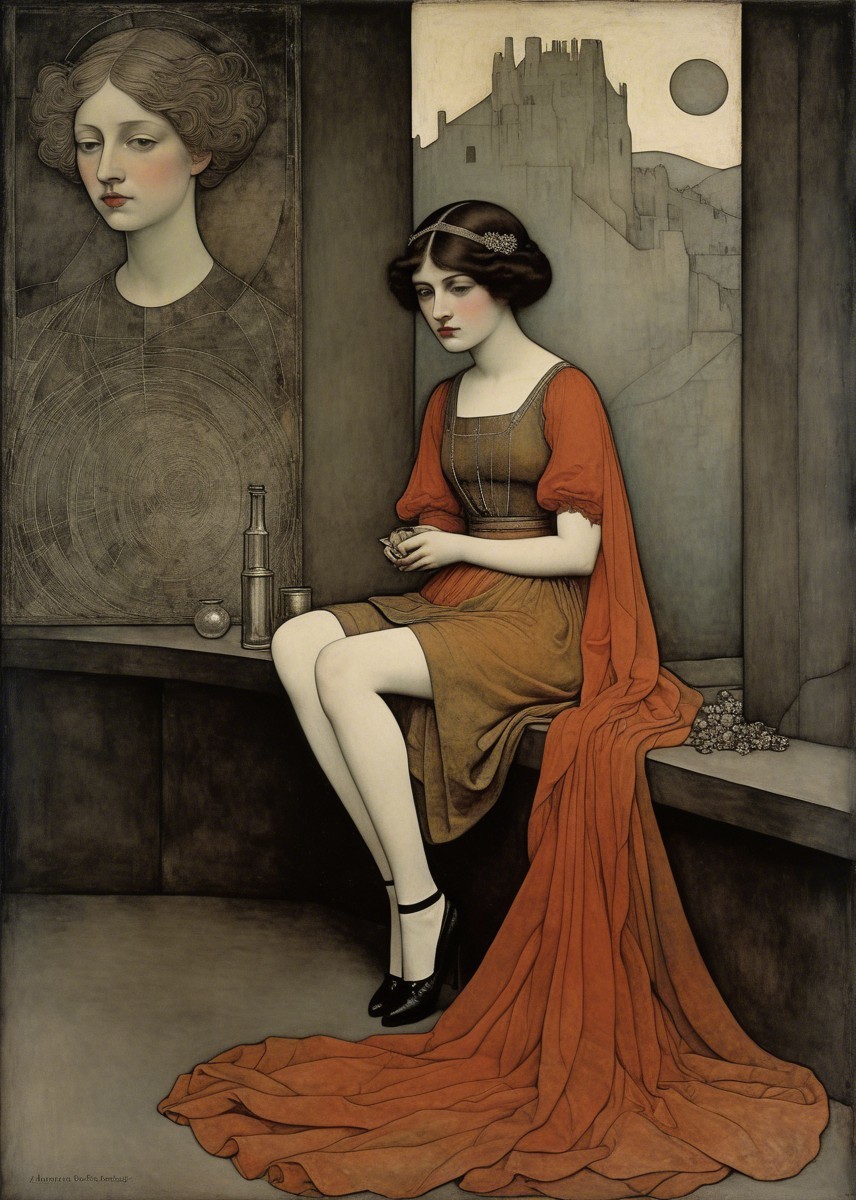 But wasn't it beautiful? Didn't we forget about the sad times for a while? Portrait under pressure, nostalgia, battery corrosion, Mercury Glass patina, topographic lines, Art Brut, moody, somber, desaturated colors, in the style of Paul Klee, Aubrey Beardsley, Arthur Rackham, Alphonse Mucha
