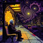 A surreal scene shows a man sitting at a vibrant bus stop, gazing at swirling galaxies above. The colorful cosmic backdrop contrasts with the urban setting, creating a dreamlike atmosphere.
