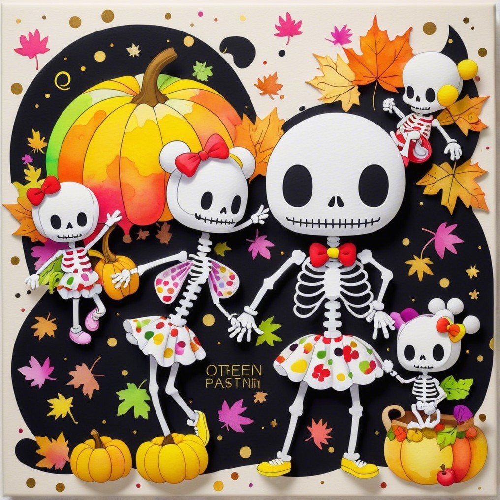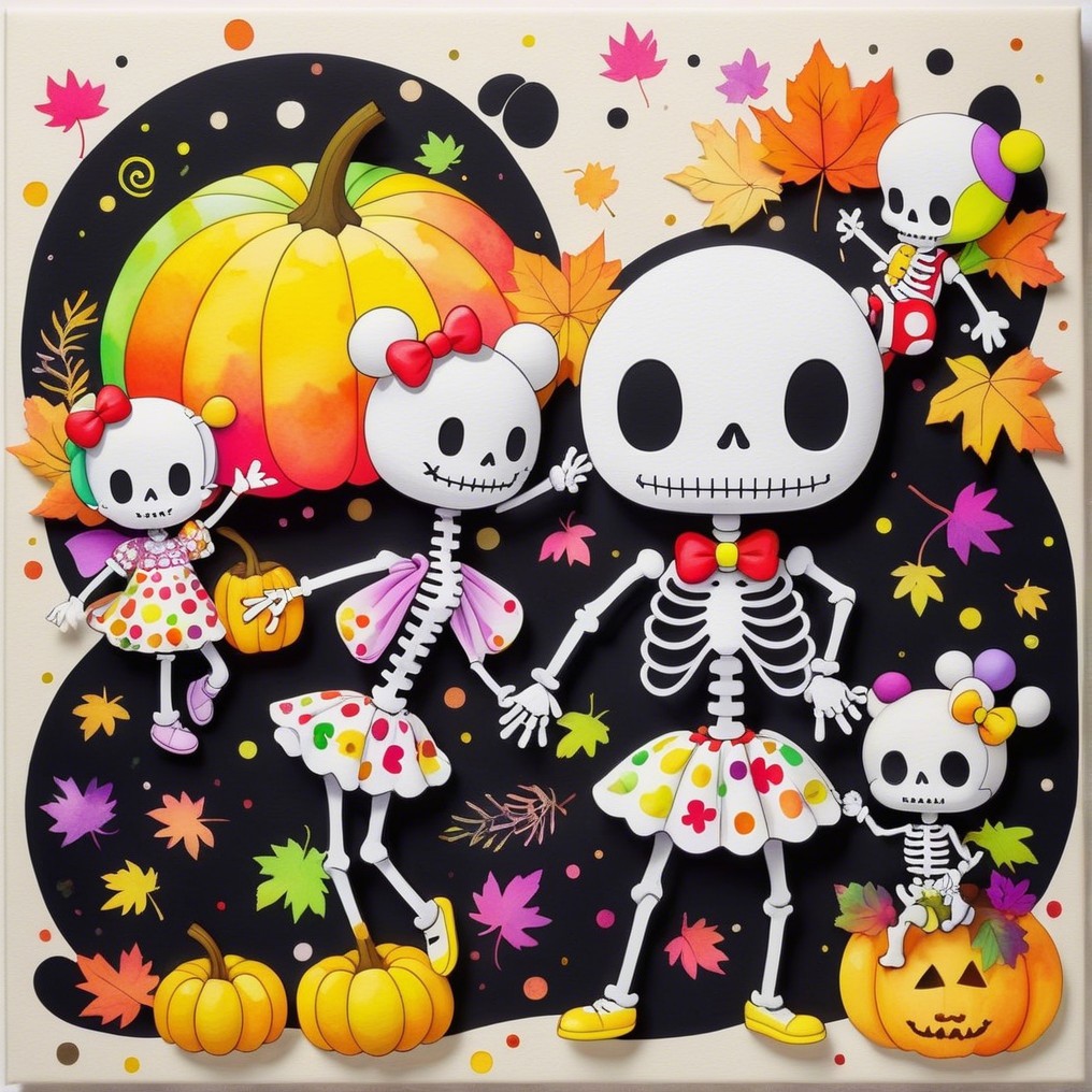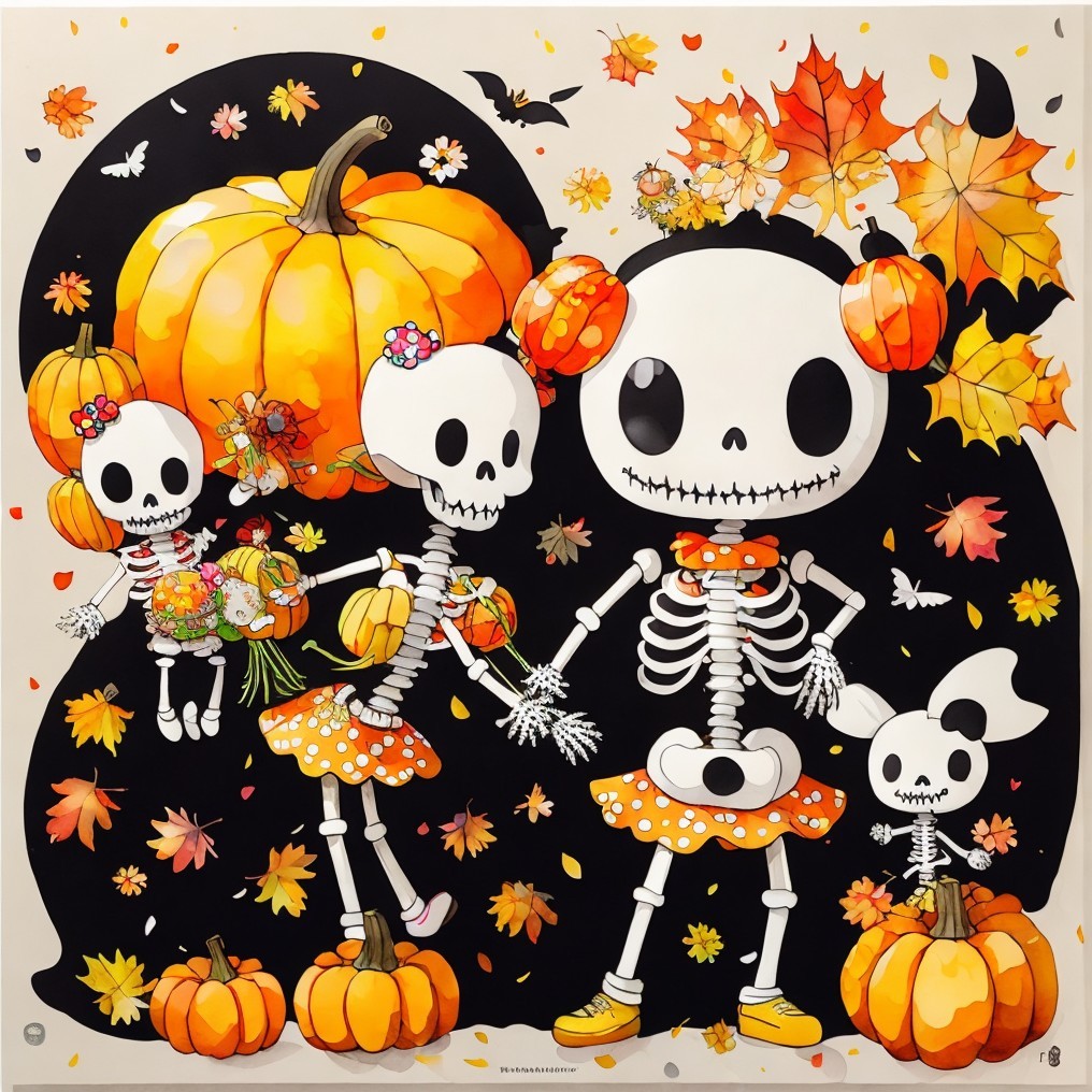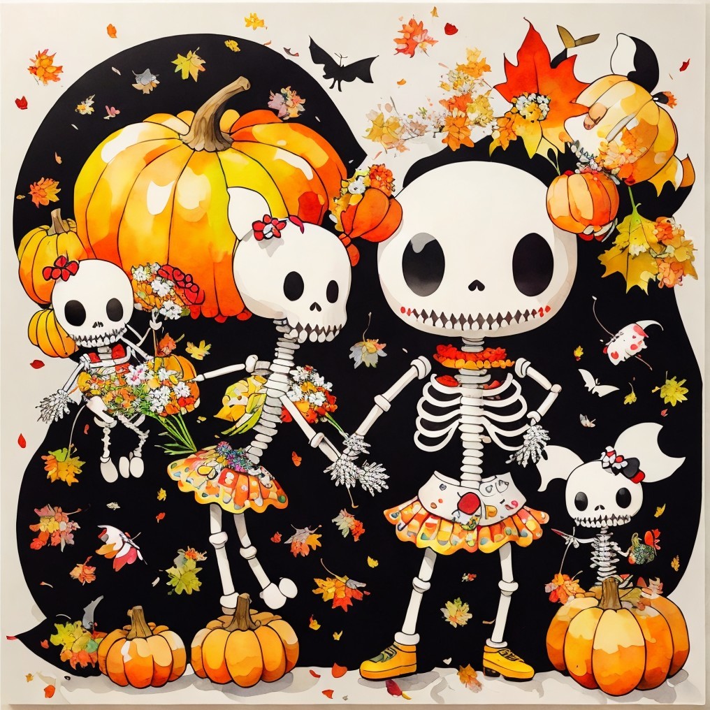 A family of cheerful skeletons celebrates autumn among pumpkins and falling leaves. Naïve, bright, and absurdly tender, this digital tableau turns mortality into festivity—where childhood whimsy meets pop surreal humor in the sweetest dance of bones.