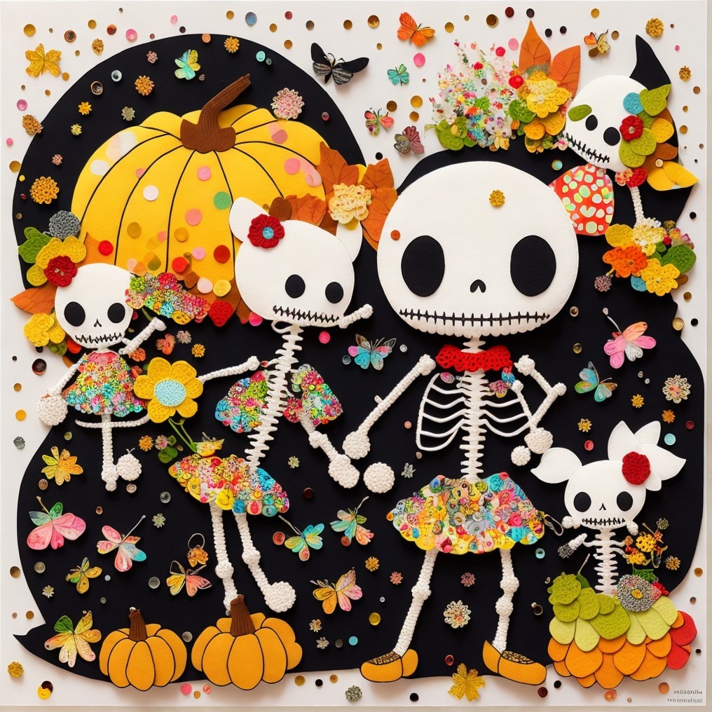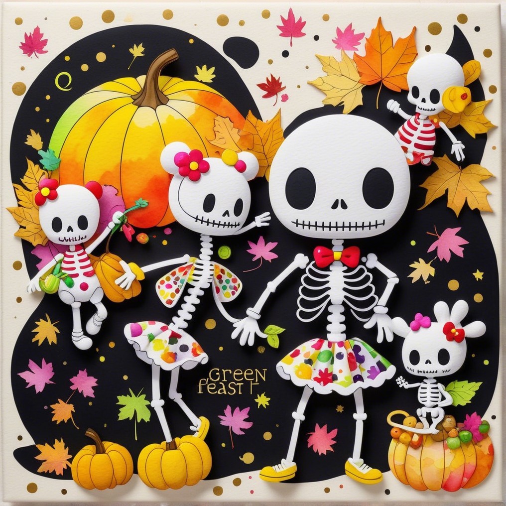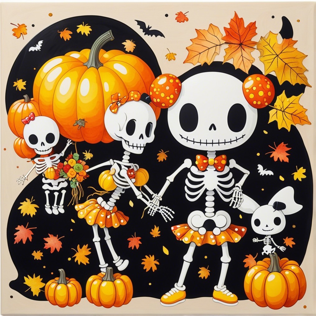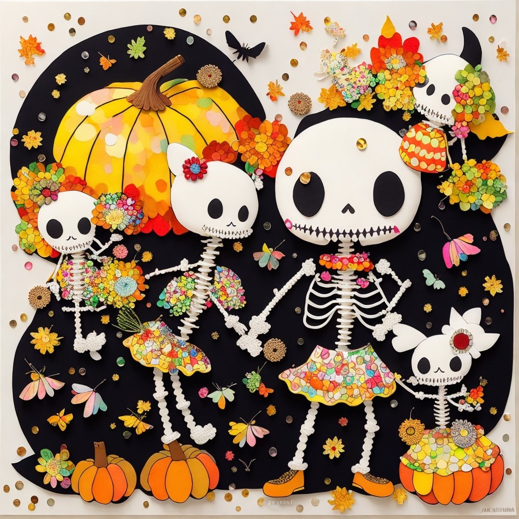 A family of cheerful skeletons celebrates autumn among pumpkins and falling leaves. Naïve, bright, and absurdly tender, this digital tableau turns mortality into festivity—where childhood whimsy meets pop surreal humor in the sweetest dance of bones.