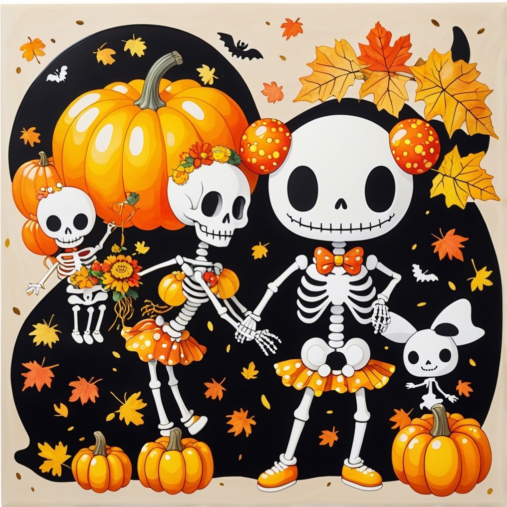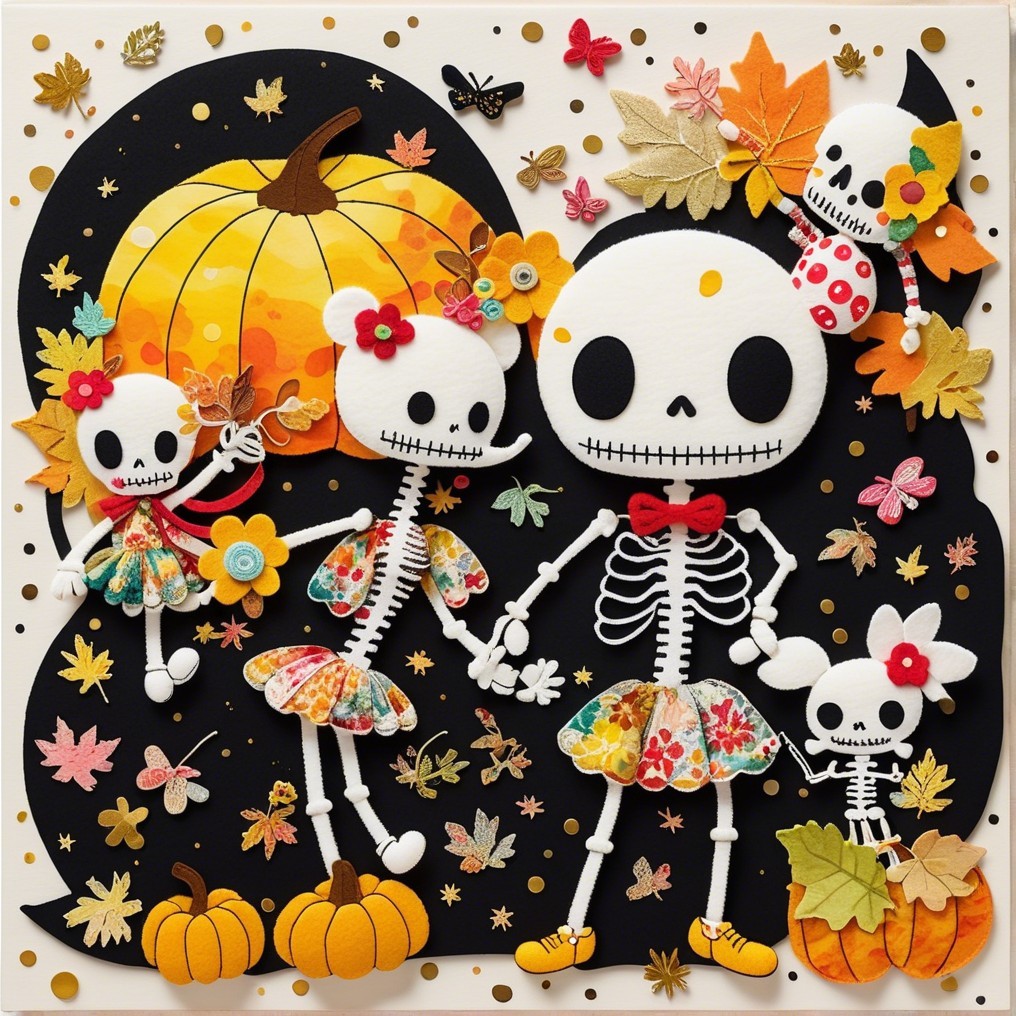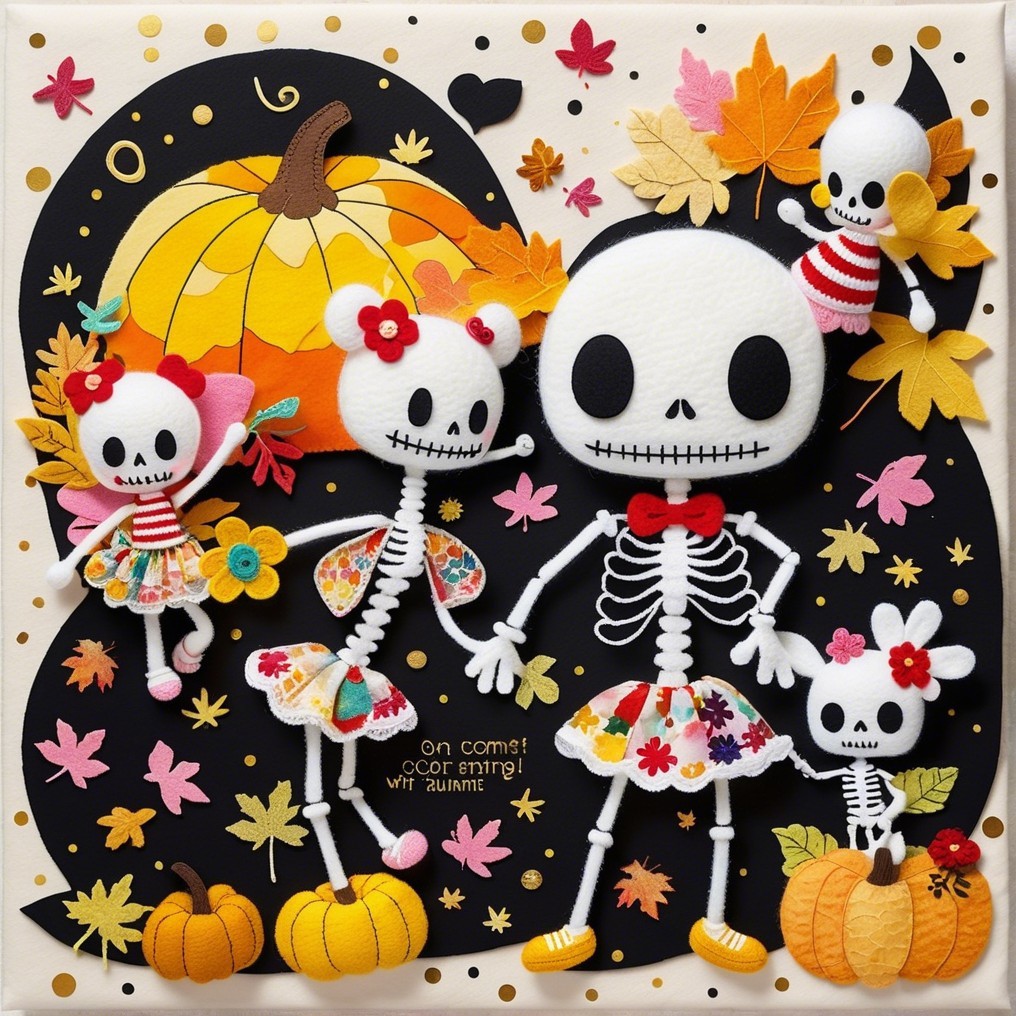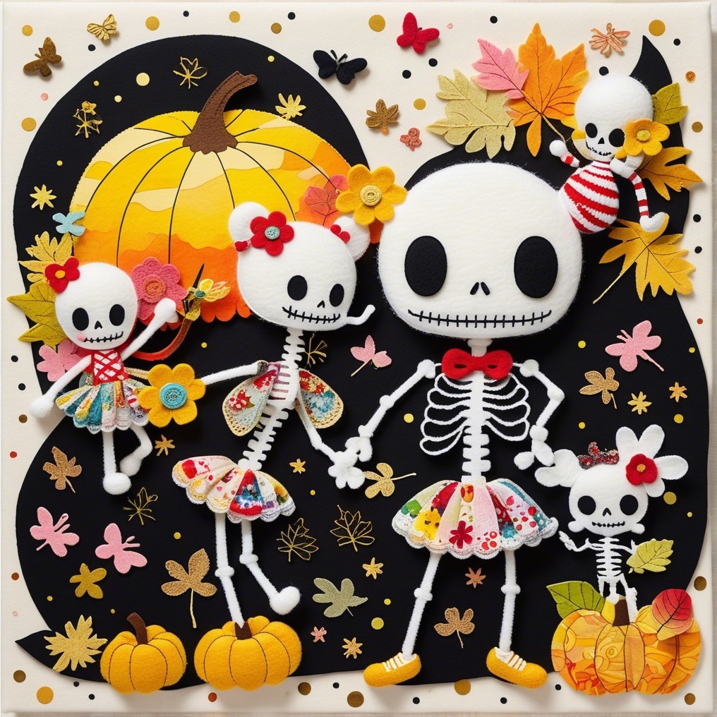 A family of cheerful skeletons celebrates autumn among pumpkins and falling leaves. Naïve, bright, and absurdly tender, this digital tableau turns mortality into festivity—where childhood whimsy meets pop surreal humor in the sweetest dance of bones.