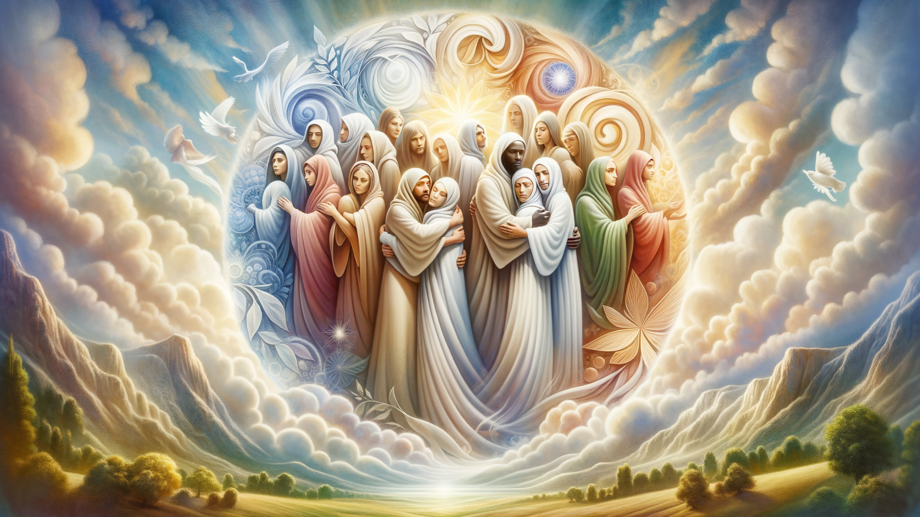 Prompt: Una representación simbólica del Reino de la paz: figuras humanas con túnicas claras abrazándose, rodeadas de naturaleza perfecta y luz espiritual.