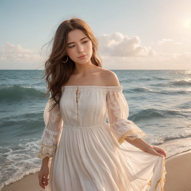 A woman in a flowing dress stands by the sea at sunset, her hair tousled by the breeze.