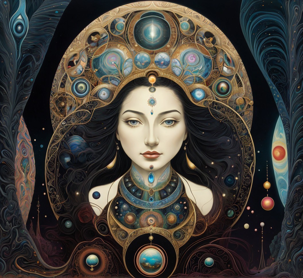 Regal Figure with Celestial Headdress in Cosmic Scene