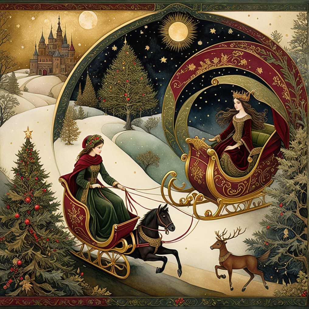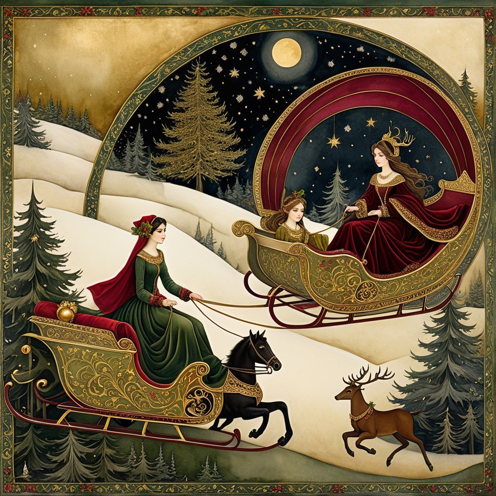 Legend of the Christmas girl and the magical Christmas, Beautiful young woman and girl in a magical Christmas sleigh riding through an enchanted winter wonderland, 3rd century Persian miniature art. Velvet Black, Shabby, Dull Gold, olive green, burgundy, Golden Ratio, Surreal Fantasy, Elegant, High Definition Ultra Fine 3D Line, Zenangle Style, Watercolor Patchwork , Arthur Rackham Style, Paul Kidby, Gediminas Prankevicius, Jacek Jerka, Extremely Detailed, Intricate, Thoughtful, HDR, Fractal, Beautiful, Award Winning, Fantasy Look, Fantasy, Crisp Quality