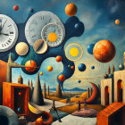 A surreal landscape features clocks and planets amidst abstract structures. Vivid colors blend with dreamlike forms, creating a whimsical, otherworldly scene that challenges perceptions of time and reality.