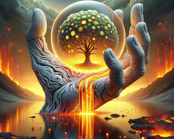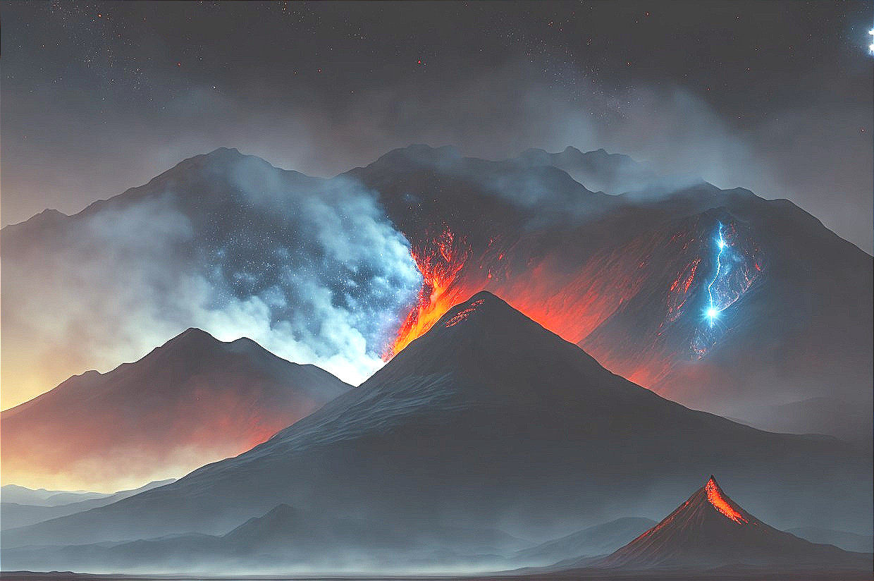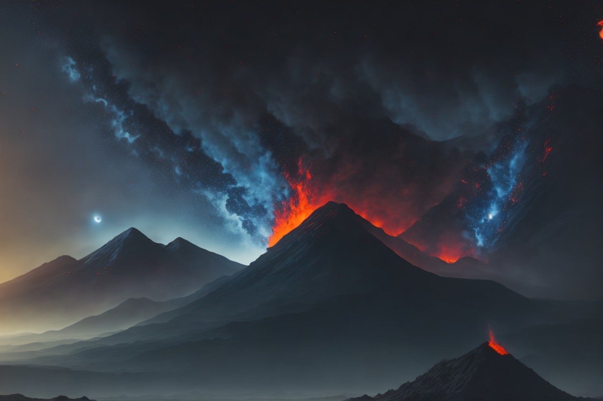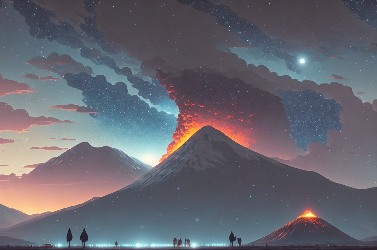 A person stands before a volcanic eruption at night under a starry sky with vivid astral colors and shooting stars.