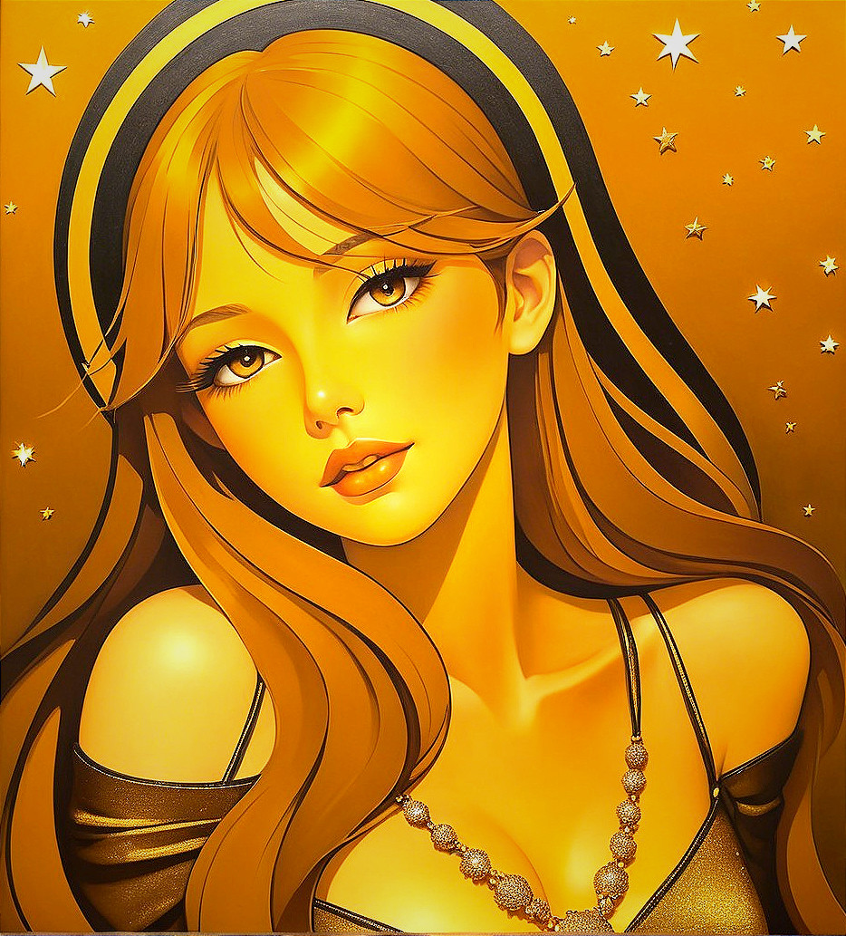 Prompt: Beneath the velvet starry sky, a luminous mystical realm unfolds. The surface shimmers with soft golden light, as if kissed by the fleeting caress of celestial beams. Metallic-honey, dark yellow, goldenrut-yellow, light-yellow, sepia tones. An untouched sanctuary emerges, where ethereal reflections merge with murmurs of an overnight fantasy, very sharp focus, showcasing an elegant, extremely detailed fantasy world. The artwork should feature imperial colors, high definition, and crisp quality, created using acrylic art techniques, layered small stripes shaping perceptible gradients, fantasy elements, glossy finish, HDR, reflections, rim lighting, parallax occlusion 1.3 inspired by Man Ray, color glitch aesthetics, subsurface scattering 1.2, brightness 1.3, dof, debeh, bokeh, ambient occlusion 1.3, raytraced shadows 1.3, colourful surreal lineage forms, Magical realism by John Buscema, dyed, nuanced painterly, simplistic intricate details and impasto textures, crafting a very attractive and beautiful dynamic lighting effect, squiggly lines, juvenile, headshot, layered and stylized portraiture by Ed Valigurski and Anselm Kiefer, painture by Jackson Pollock using pastel colors in the style of embossed pointilism merged with chaotic orphism, action painting, plasticity 1.4, vampire face type, gorgeous, juvenile, tetradic color scheme goldenrut-yellow magenta purple lilac, flecks, dots, enlightened thinned painture, bright and opaque,