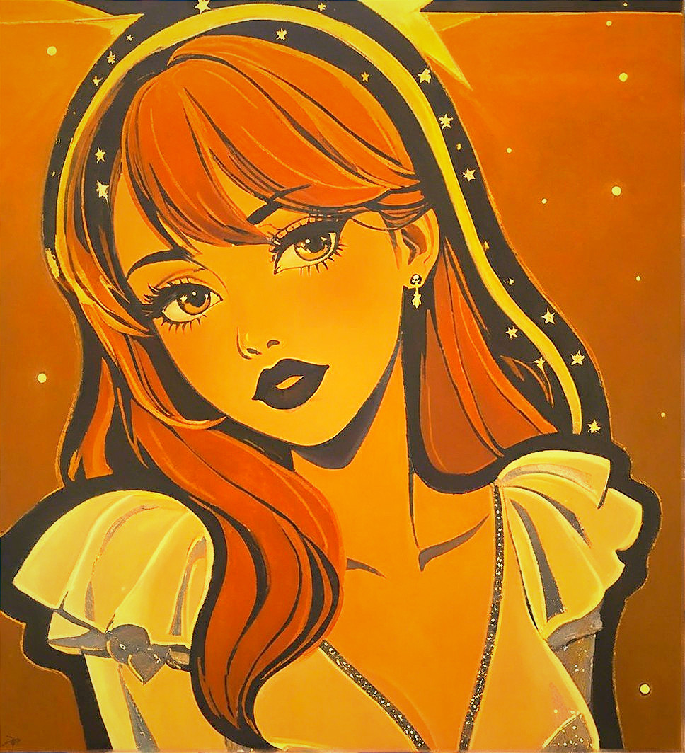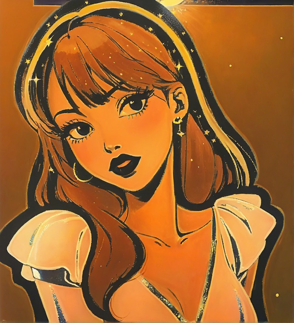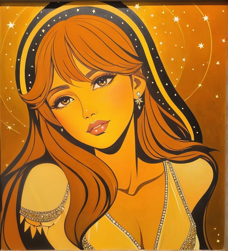 A vibrant portrait of a young woman with long, flowing orange hair, adorned in a sparkling black outfit. Her captivating gaze and golden tones evoke a warm, celestial atmosphere.