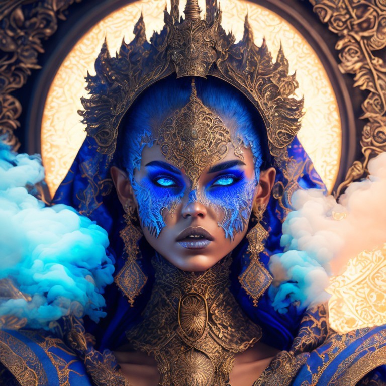 A mystical, blue-skinned woman with ornate jewelry and a fiery planet behind her, exuding otherworldly power and majesty.