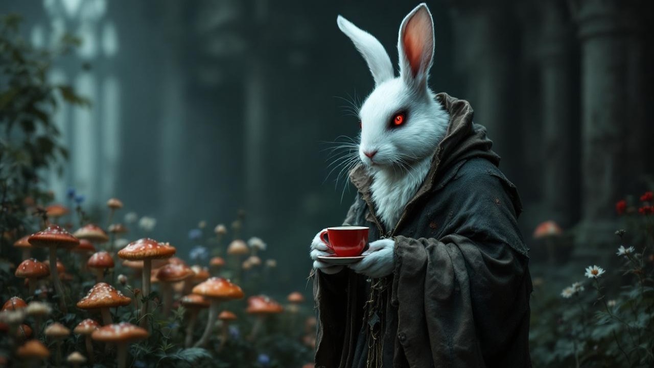 Prompt: "A gothic fairytale anthropomorphic white rabbit, standing, wearing a tattered, hooded robe, holding a red teacup and saucer, red eyes, ominous, fantastical cottagecore scene, wildflowers and fly agaric mushrooms, muted color palette, volumetric lighting, cinematic still, dark academia, textural details on the robe, misty background, gothic architecture, mysterious, dark fantasy aesthetic, dramatic lighting."