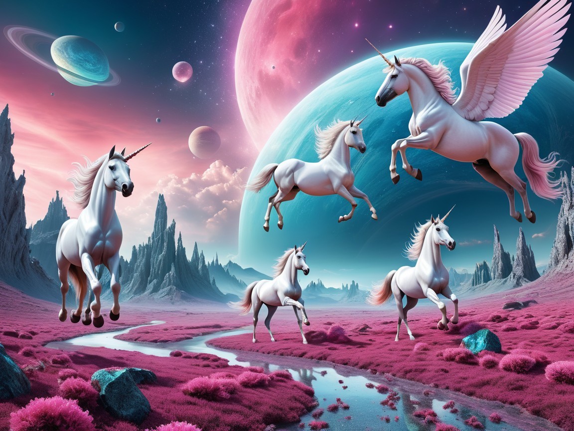 A fantastical scene depicts several majestic white unicorns with golden horns and flowing manes and tails, some with delicate pink wings, prancing and leaping across a vibrant alien landscape. The ground is covered in lush, deep pink vegetation, with a winding, reflective blue river or stream cutting through it. Large,
