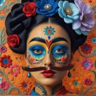 A woman in a frontal view, A narrow, long mustache like Salvador Dali's, half portrait, looks like Frieda Kalo, flowers in her blue-black hair, dressed in colorful Mexican clothing with embroidery. Style: Op art, trippy fractal