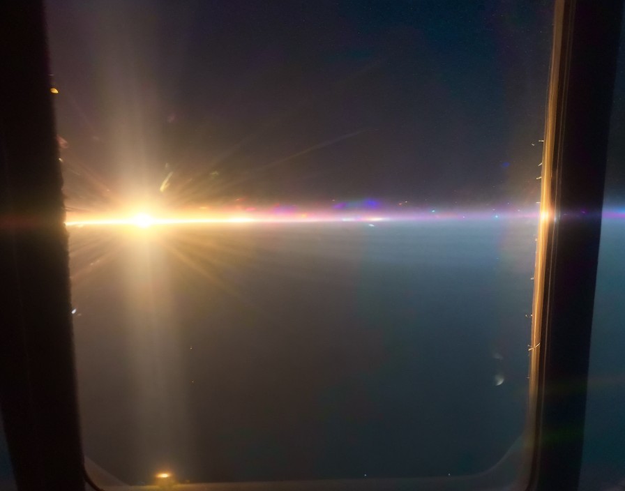 Airplane Window View of Twilight Horizon and Earth Curvature
