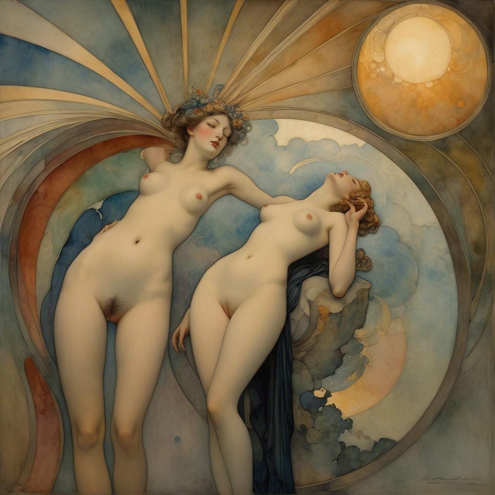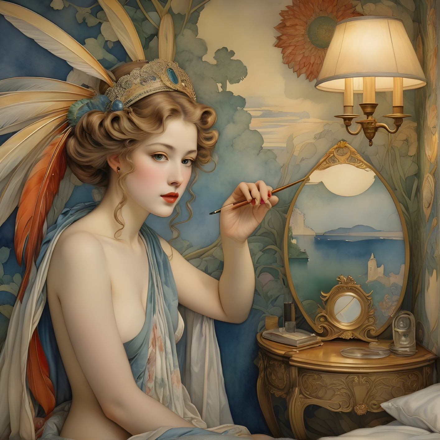 A serene woman with intricate hair and a feathered adornment gazes thoughtfully into a mirror. She's surrounded by a lush, natural backdrop, creating an ethereal, dreamlike atmosphere.