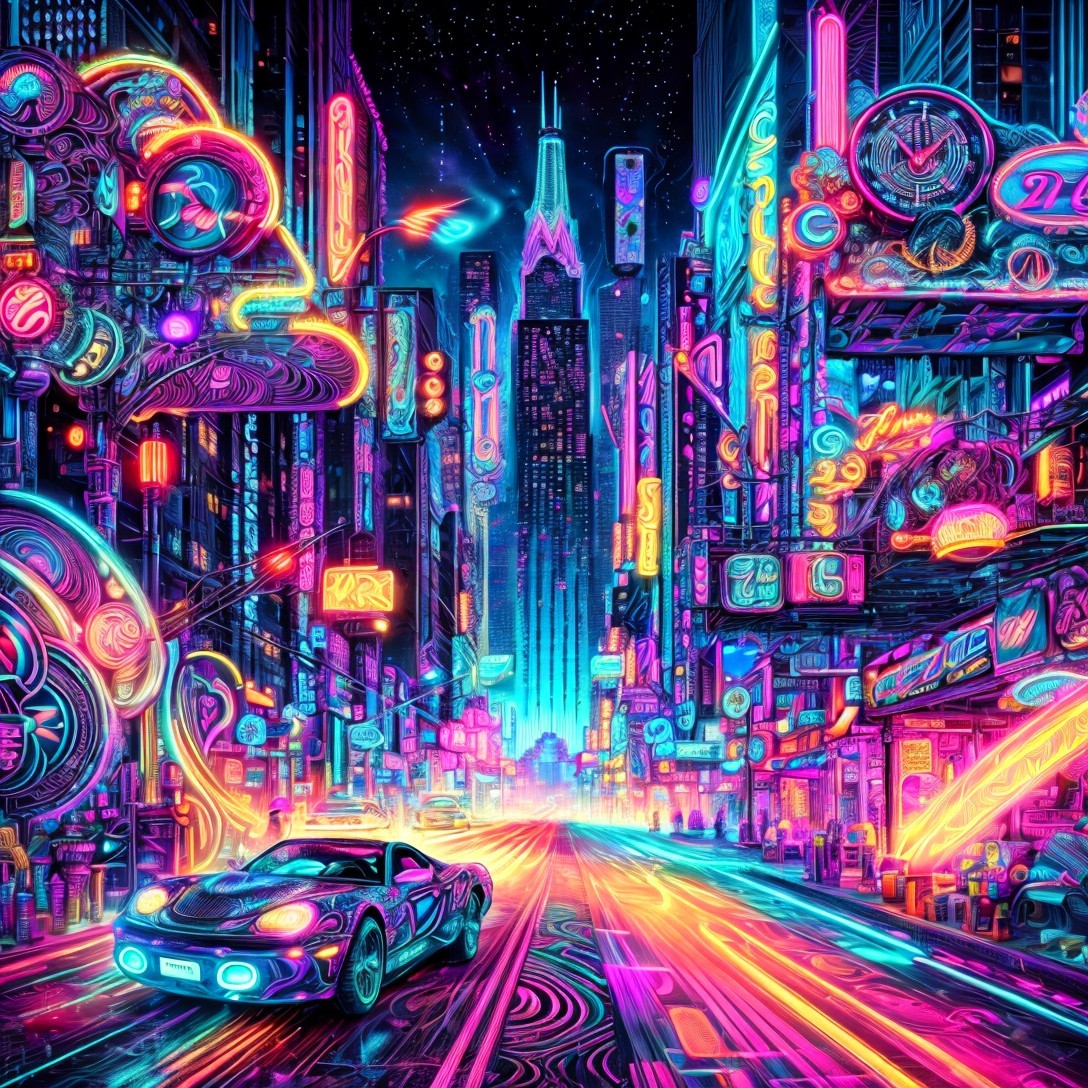 captivating and immersive blend of Zentangle and Vaporwave art styles, this cinematic illustration transports viewers into a dreamy, retro-futuristic world. The mesmerizing Zentangle patterns form a vivid and glowing background, filled with intense colors and surreal elements. A neon-lit Chicago cityscape emerges in the foreground, with futuristic cars gliding along the streets, emitting a nostalgic ambiance. Floating islands and ethereal beings add a sense of wonder, while glitch effects and pixelated text elements provide a touch of digital distortion. Dark fantasy elements, such as graffiti and conceptual art, enhance the surreal atmosphere. The 3D render offers intricate detail and vibrant aesthetics, making it a unique fusion of two distinct art styles. Graffiti and conceptual art add a dark fantasy element, further, photo, 3d render, dark fantasy, conceptual art, illustration, vibrant, painting, ukiyo-e, cinematic, graffiti