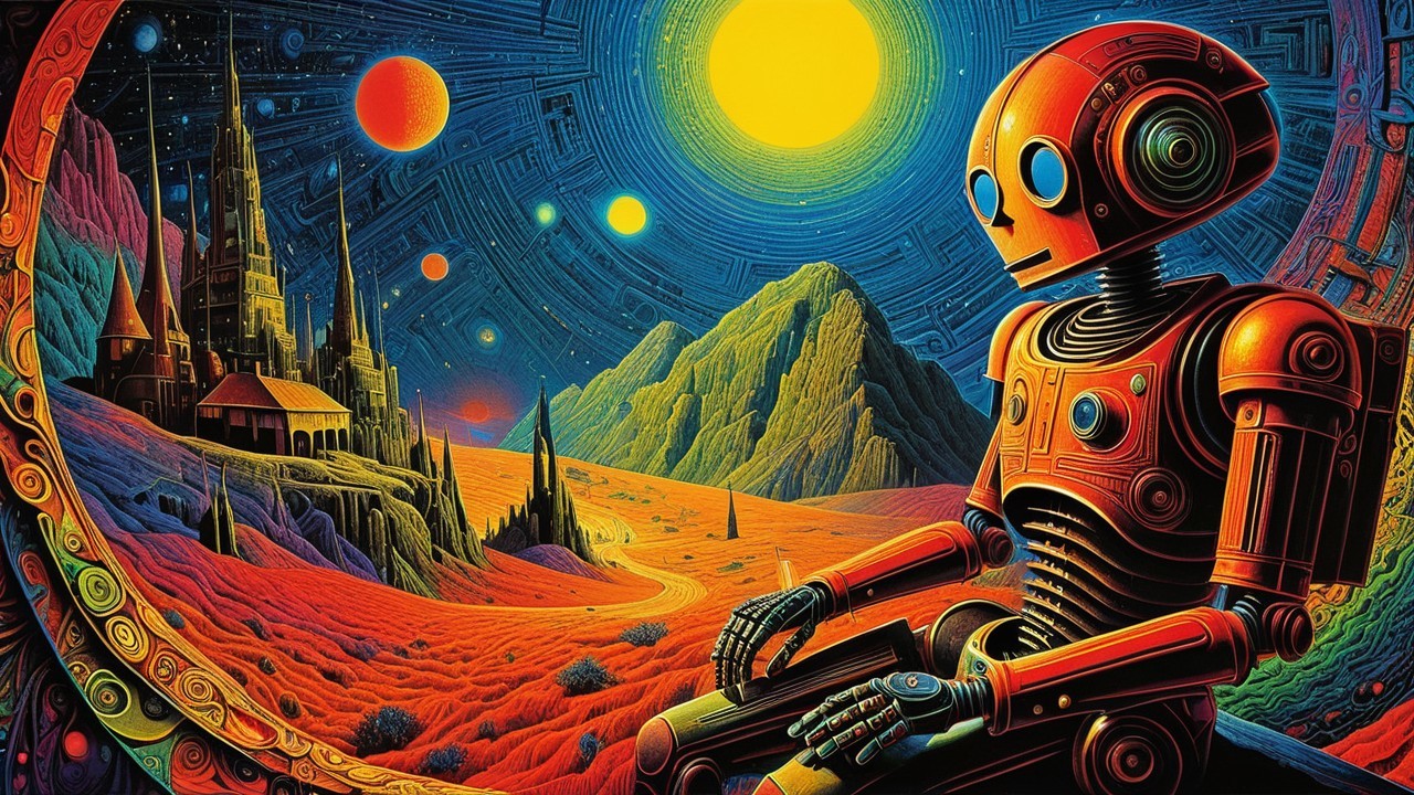 Prompt: "Very intricate, colorful and astonishingly beautiful psychedelic robotic mechanisms communicating and playing with a dazed psychedelic explorer in otherworldly setting"
