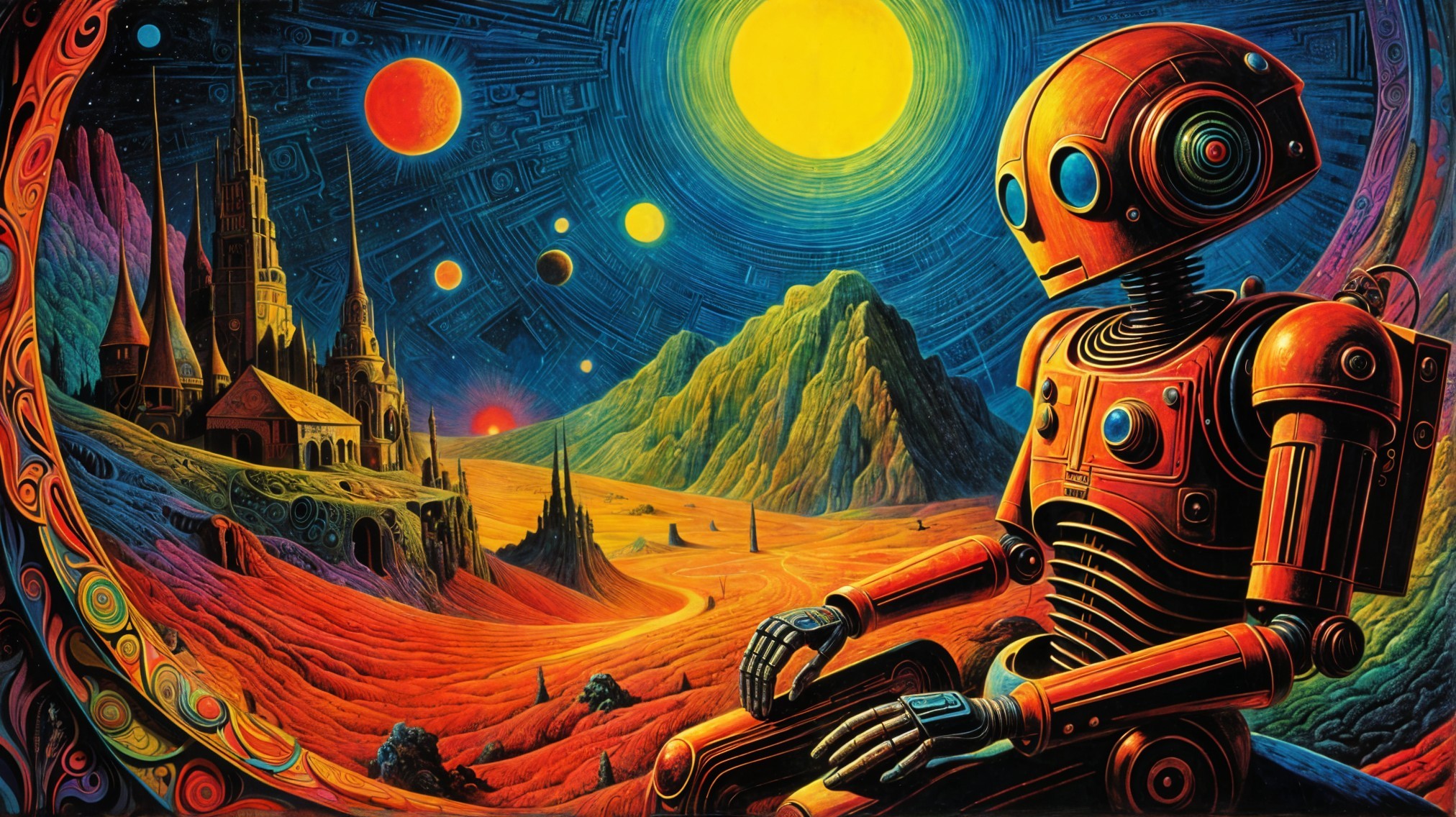 Prompt: Very intricate, colorful and astonishingly beautiful psychedelic robotic mechanisms communicating and playing with a dazed psychedelic explorer in otherworldly setting