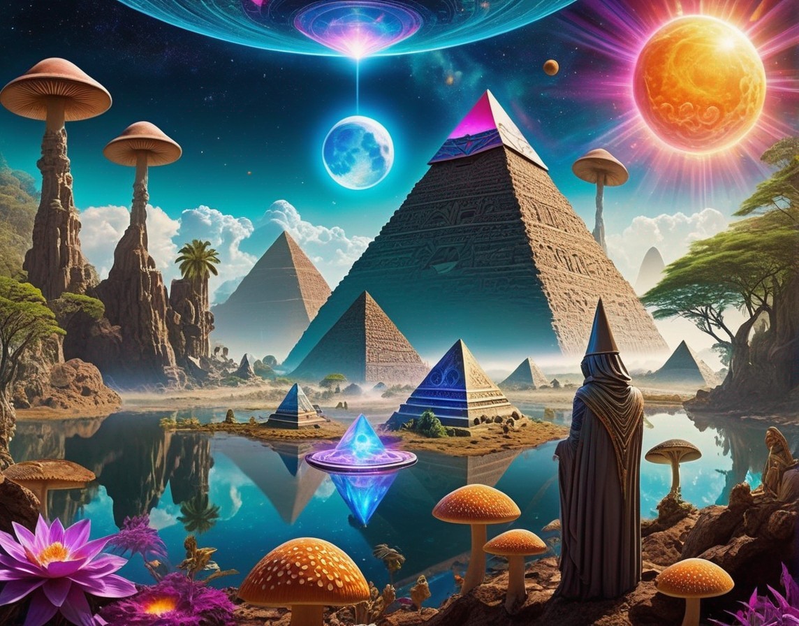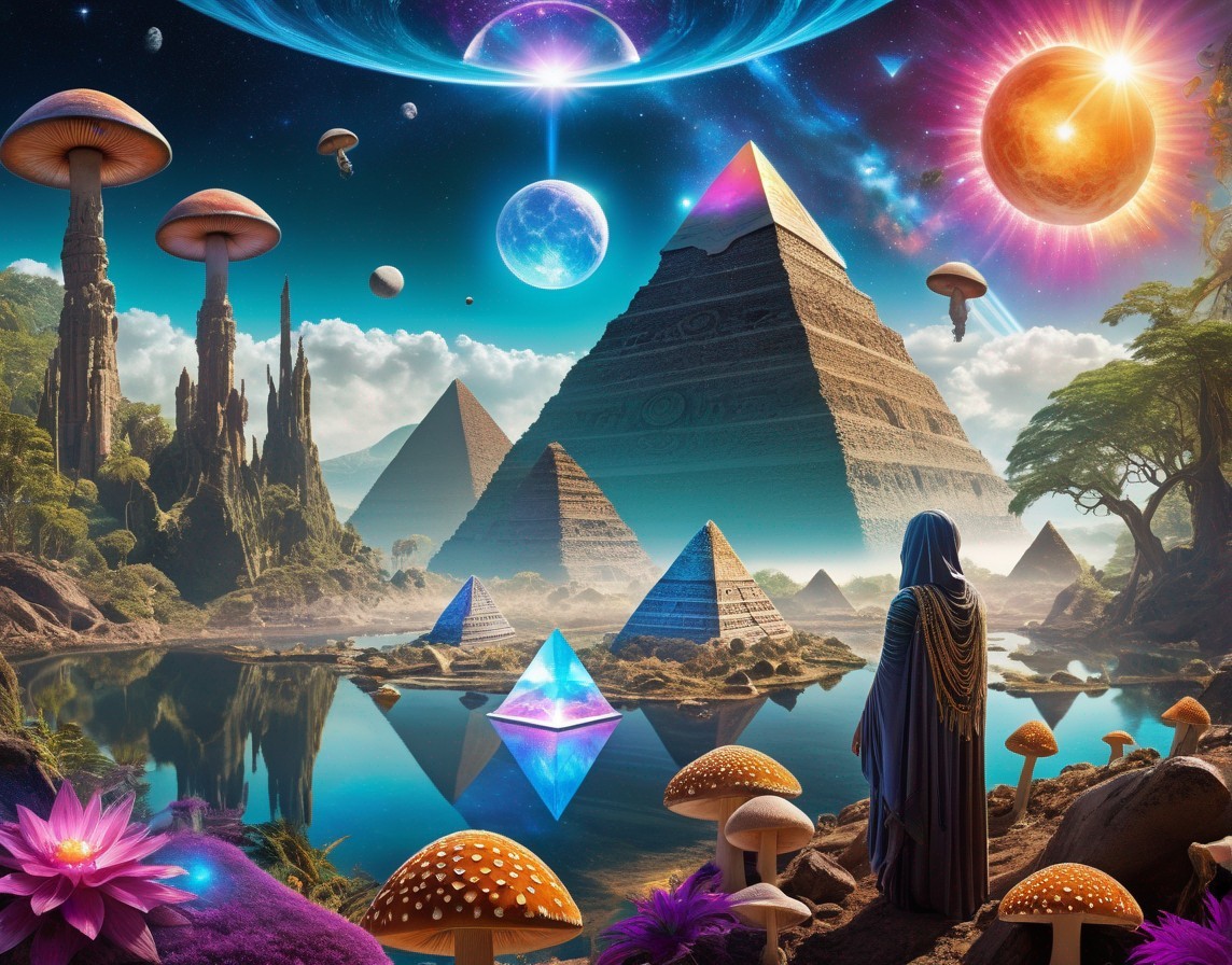 A fantastical landscape with pyramids, a cloaked figure, vibrant mushrooms, celestial bodies, and water reflecting a colorful sky.