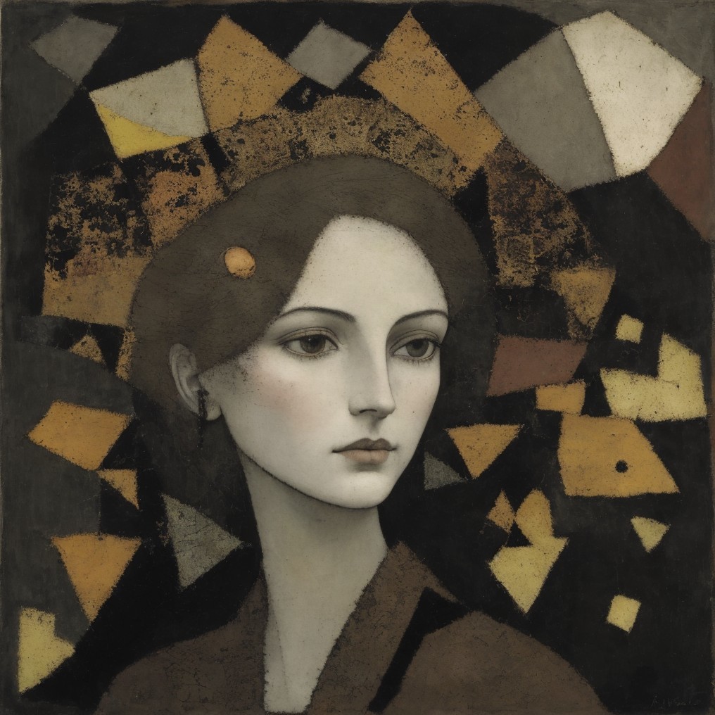 The artwork features a stylish woman with dark wavy hair, wearing an ornate hat adorned with leaves. A full moon illuminates the night, enhancing her vintage elegance against a dark backdrop.