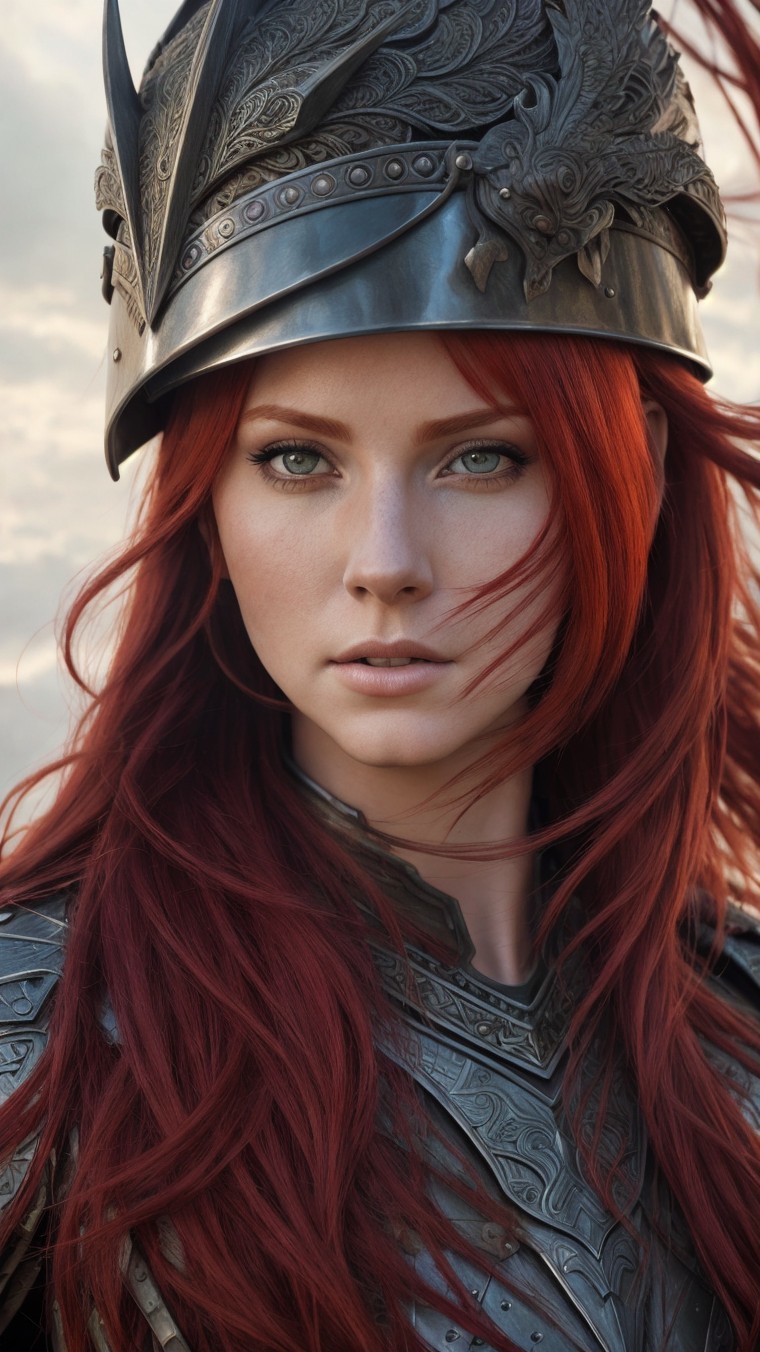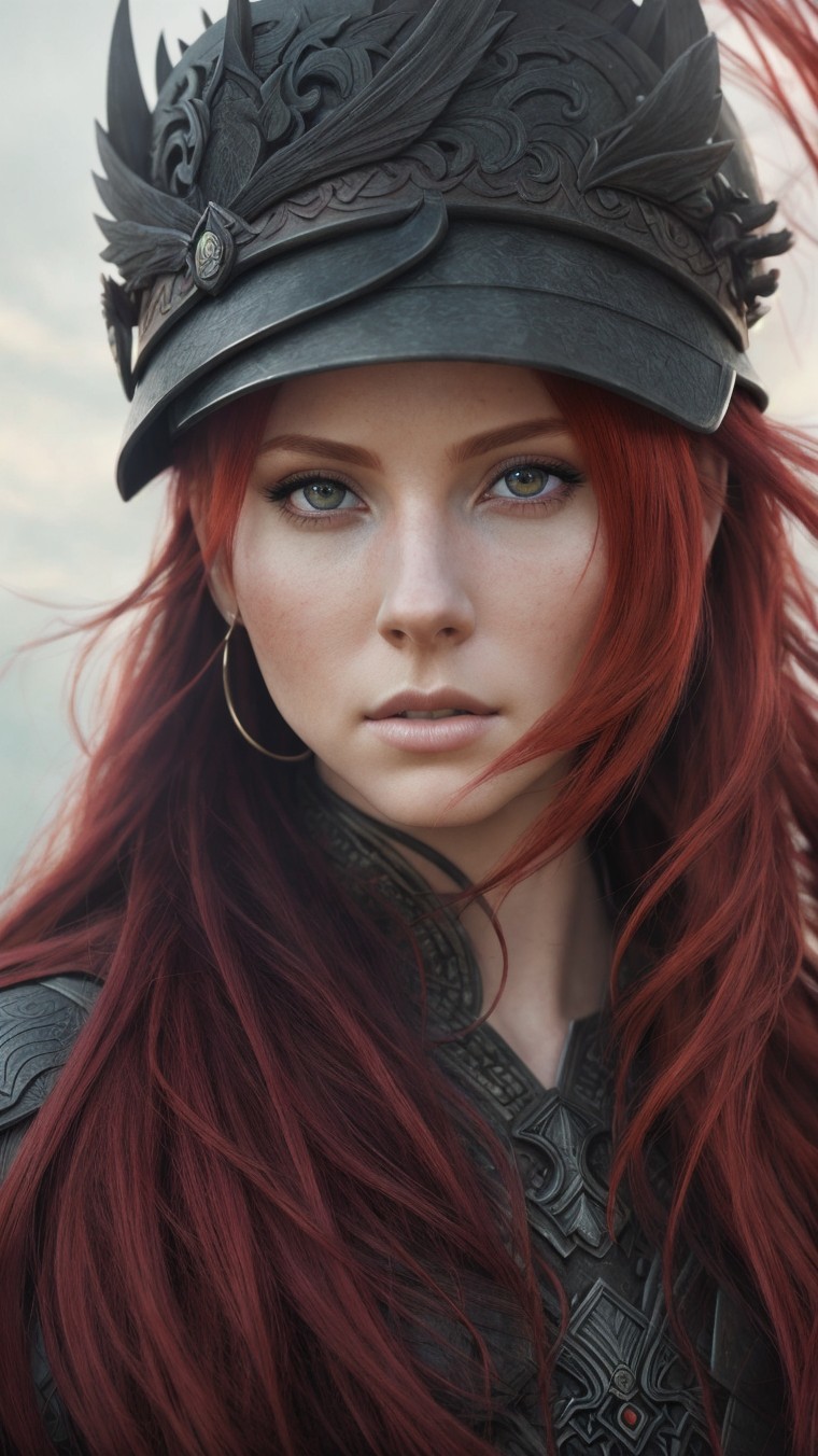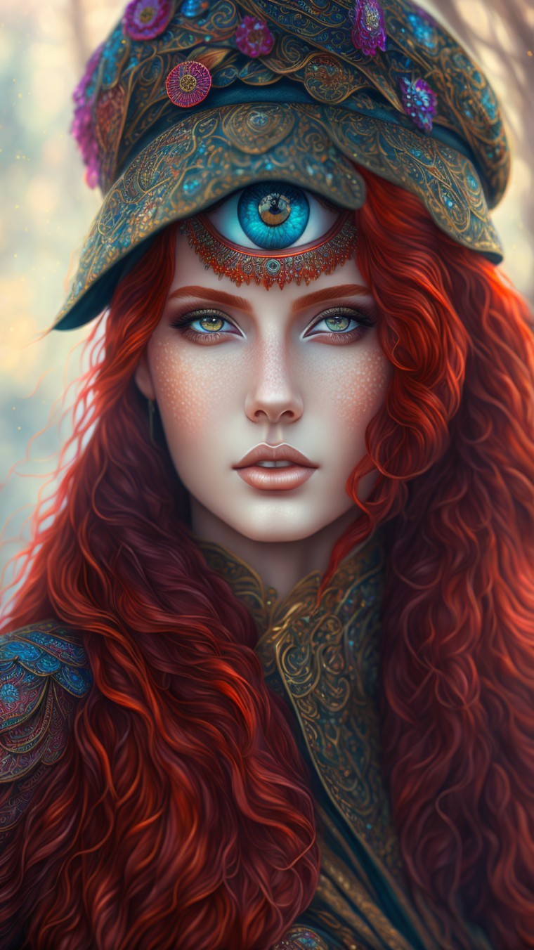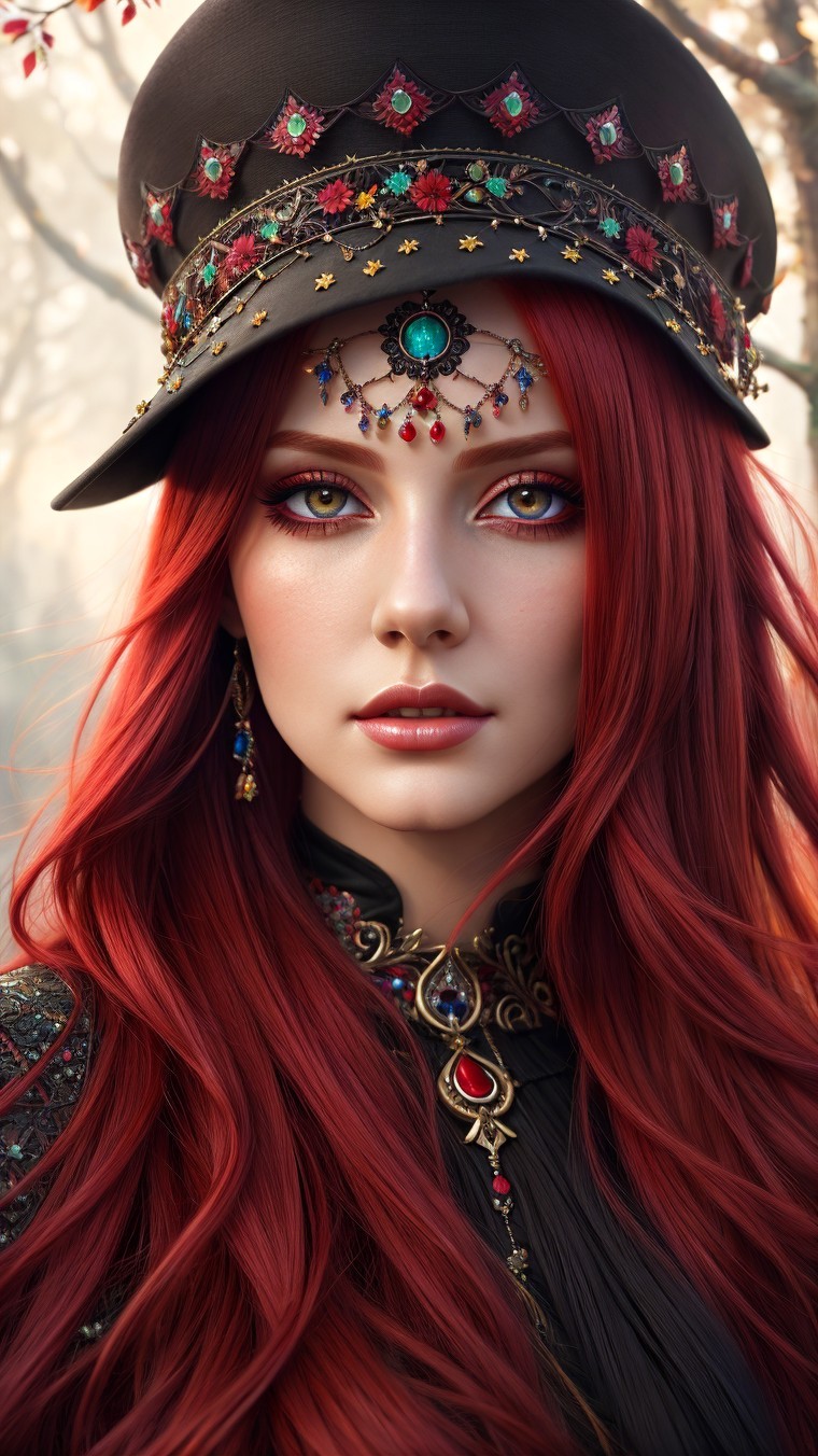 A digital portrait of a woman with vibrant red hair, striking eyes, and an ornate hat adorned with jewels and foliage against a soft, glowing background.