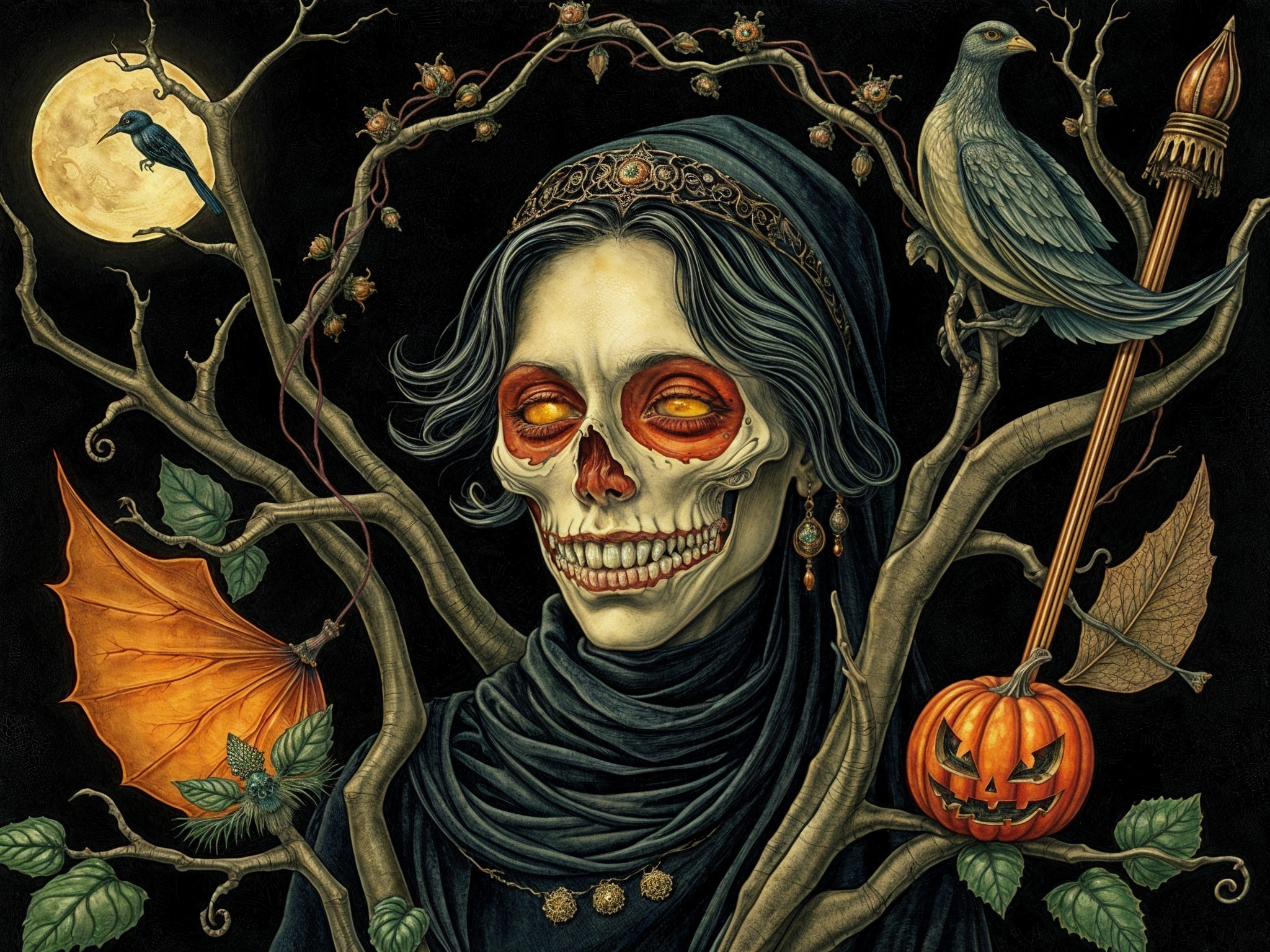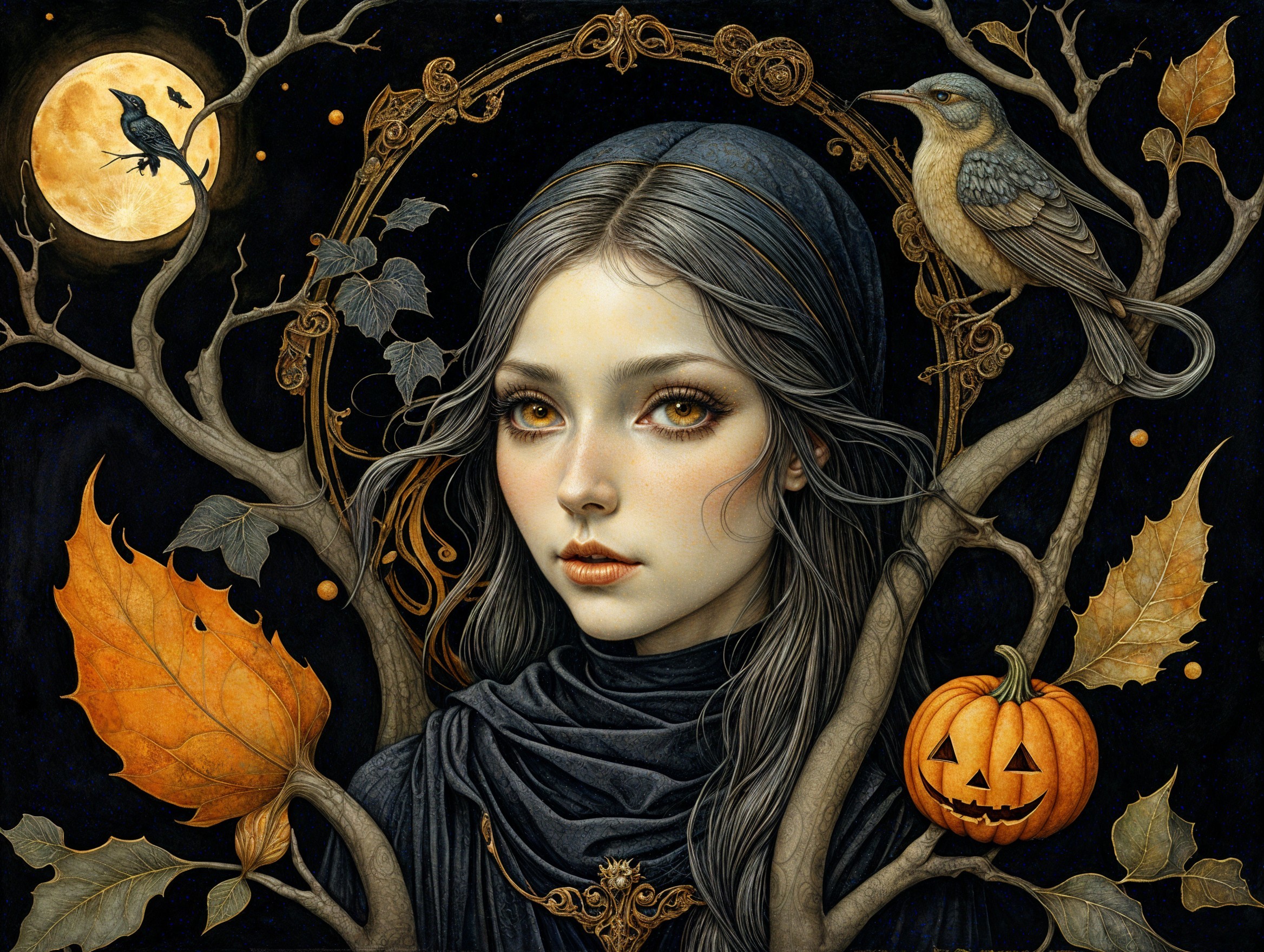 Legend of the Girl of the underworld. Halloween. Medieval Artists art nouveau Style, Velvet Black, Shabby, Dull Gold, Amber Gray, Golden Ratio, Surreal Fantasy, Elegant, High Definition Ultra Fine 3D Line, Zenangle Style, Watercolor Patchwork ,