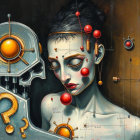 A surreal artwork featuring a woman with an expression of contemplation. Her head blends with mechanical elements, incorporating colorful orbs and question marks, hinting at themes of identity and technology.