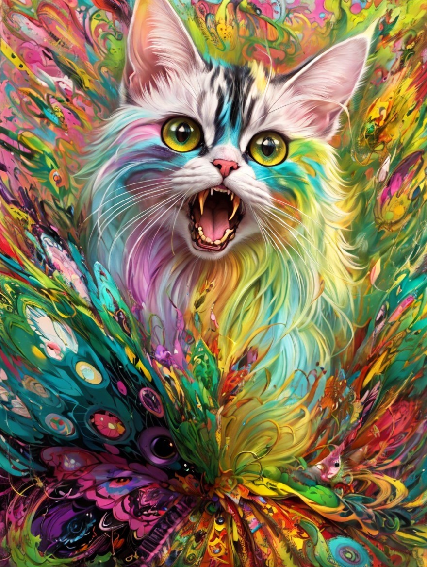 + Prompt:151515; himsical fantasy painting, crazy cartoon-style surreal cat, full-length, hyper-surreal with squinty big eyes, vibrant colors, detailed fur texture, Alex Pardee-inspired style, intricate and dynamic background by Carne Griffiths, imaginative and playful composition, exaggerated features, whimsical elements, energetic and lively atmosphere, high level of detail, bright and bold color palette, surreal and dreamlike setting, intricate linework, fantastical and otherworldly, dynamic lighting to enhance depth and mood.A whimsical windmill in the meadow featuring a joyful running cat, fluffy and cute, painted in a Speedpaint style by Ernst Haeckel and Ismail Inceoglu. Mix of large and medium brush strokes, paint splatters, and drips by Gazelli and Robert Oxley. A masterpiece with correct proportions, 8k resolution, highly detailed and intricate. Trending on ArtStation, blending Aquarelle painting with the style of Thomas Wells Schaller.