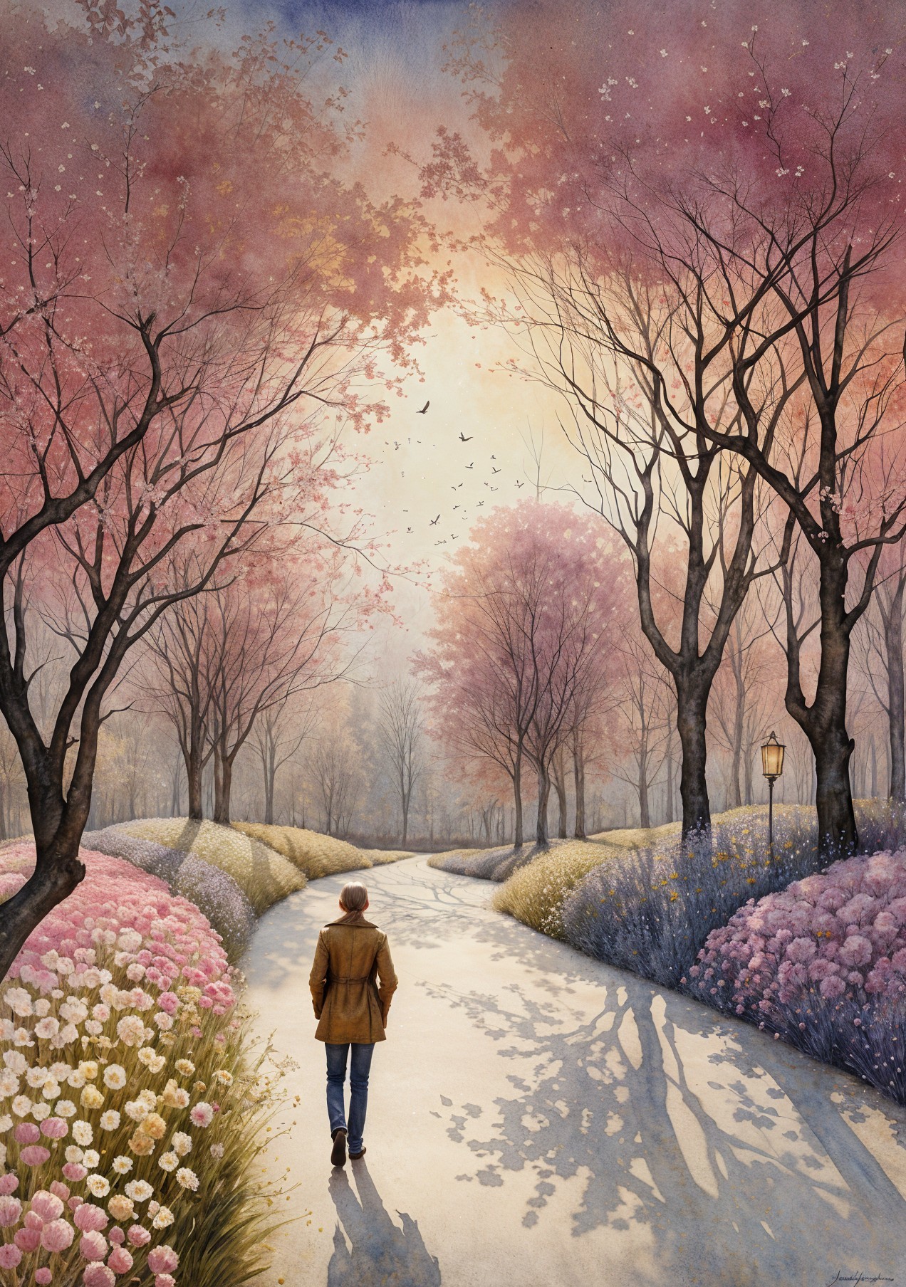 A woman in a yellow coat stands on a winding path surrounded by vibrant flowers and trees, gazing at a large sun rising over gentle hills in a serene, dreamlike landscape.