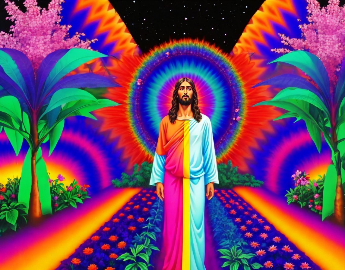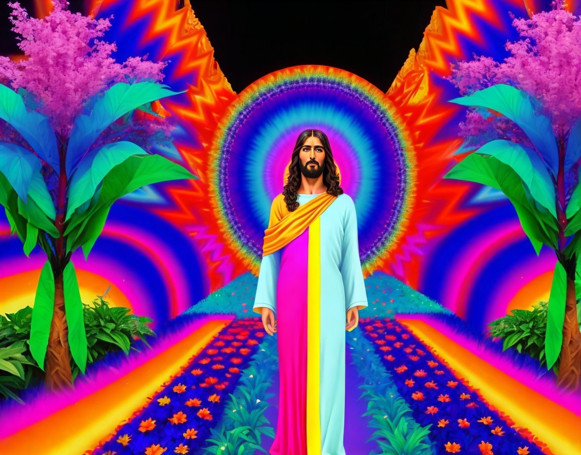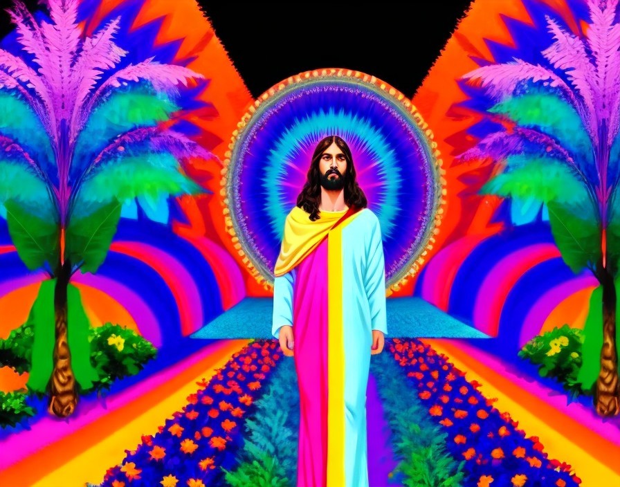 A colorful image of a figure resembling Jesus with a halo, surrounded by vibrant flowers and psychedelic patterns.