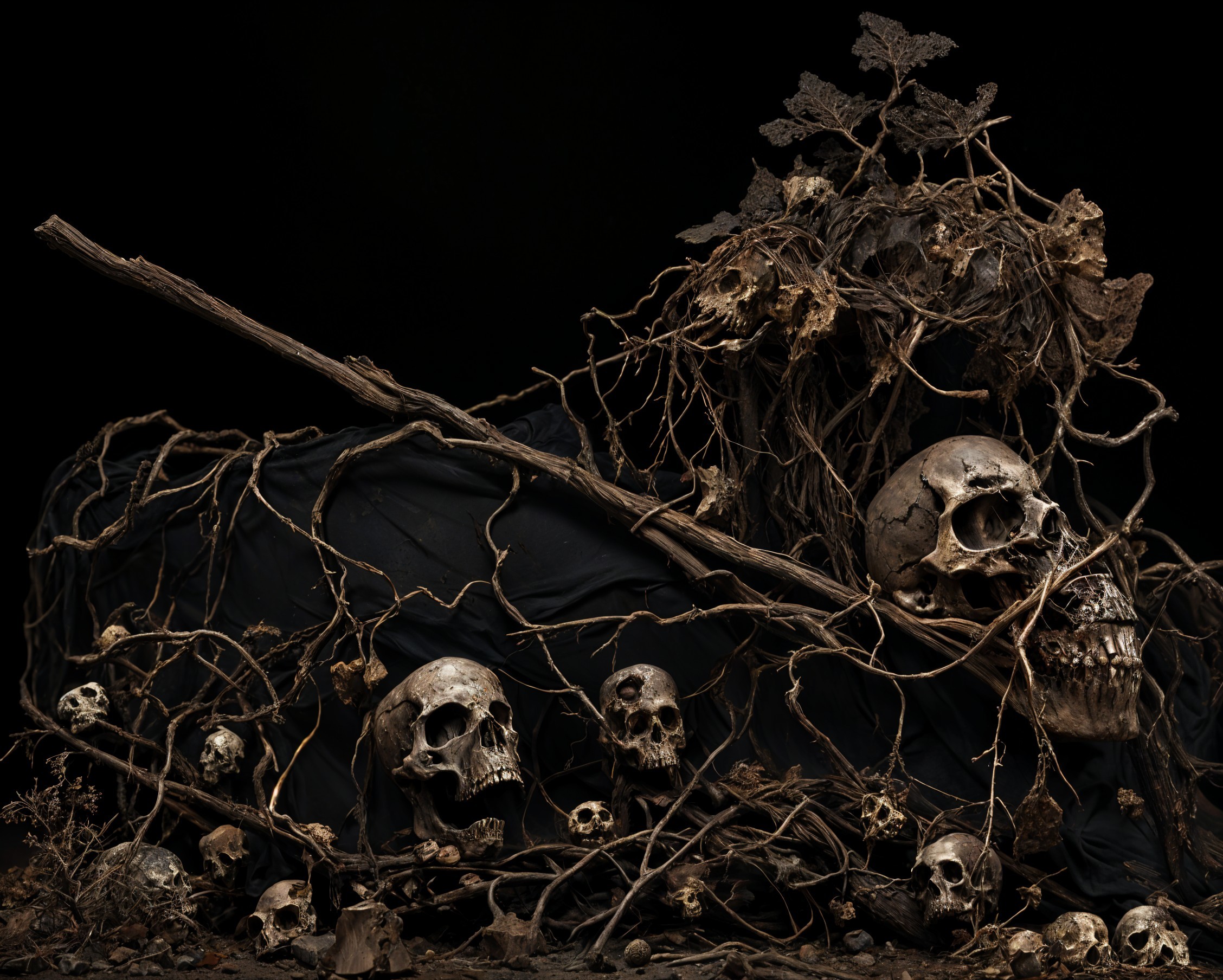 + Prompt:a mysterious haunting appearance, beauty and horror. intricate **dry cracked earth**, desiccated and ancient, reminiscent of skeletal features eyes strikingly dark with a hint of gold, giving an eerie glow with fierce intensity. dark, wild, rough and ominous. Elements of embellishment, such as earth tones, small skulls, and natural materials, are tangled in the hair. dark **metal surfaces covered in patina**, worn, time-weathered appearance. **rust on metal**, ancient, ritualistic aesthetic is a dark, smoky background, layered with **volcanic ash** and faintly shimmering **frosty mist**. These atmospheric elements enhance the sense of an otherworldly presence.