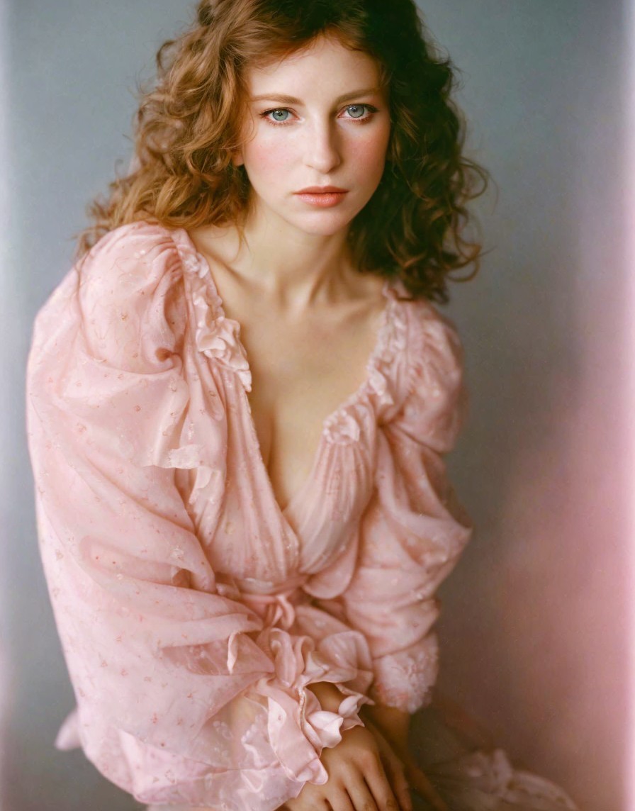 A woman with wavy hair in a pink, ruffled robe gazes directly at the viewer, her expression pensive and serene.