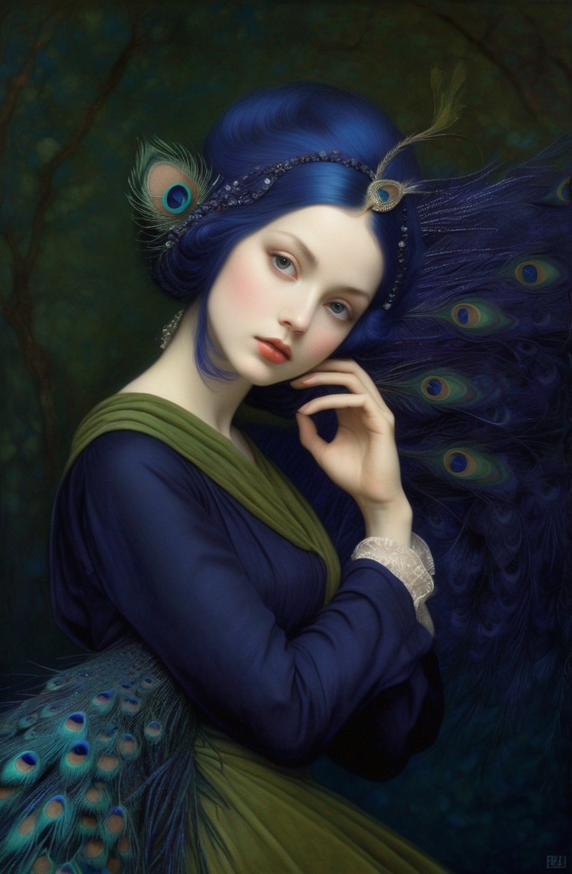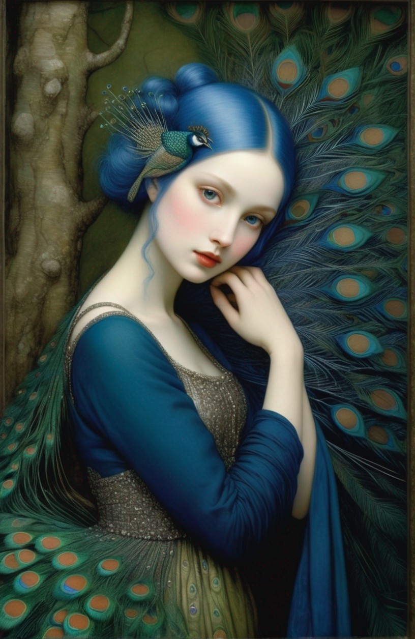 Woman with peacock headpiece sitting on tree in flowing blue gown.