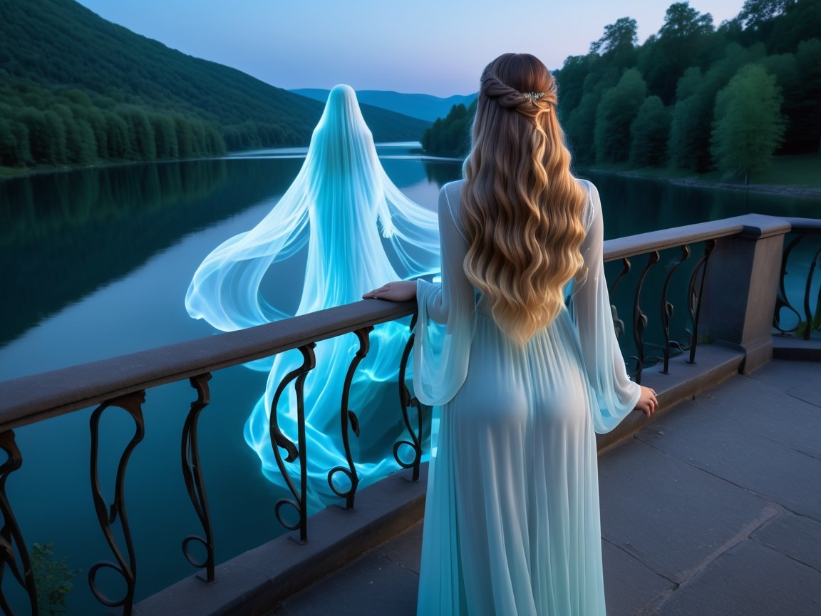 A serene scene of a woman in a flowing light blue dress gazing at a translucent figure hovering over a tranquil lake, surrounded by lush green hills under a twilight sky.