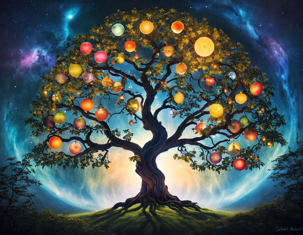 Centered view of an elegant, gracious, tree of life with glowing fruit in the style of Zacharias Martin Aagaard; celestial, ornate, vibrant and vivid, soft billowing mist, darkness; bright, heavenly, swirls, nebula vines, twirling, billowing, high contrast, symobolism, magical, mystical, mystifying, obscure
