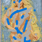 A vibrant, textured painting of a fluffy orange tabby cat against a blue and yellow background. The cat poses with one paw raised, showcasing intricate brushwork and lively colors.