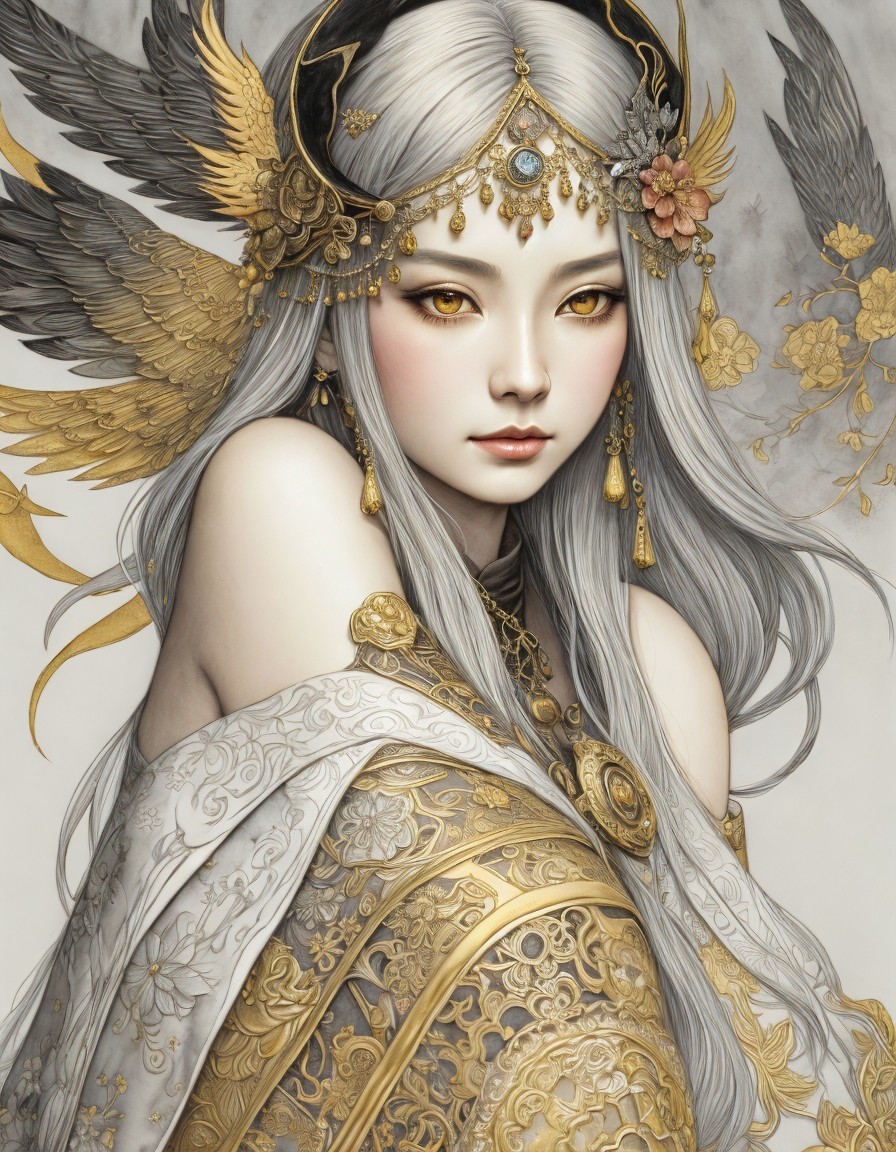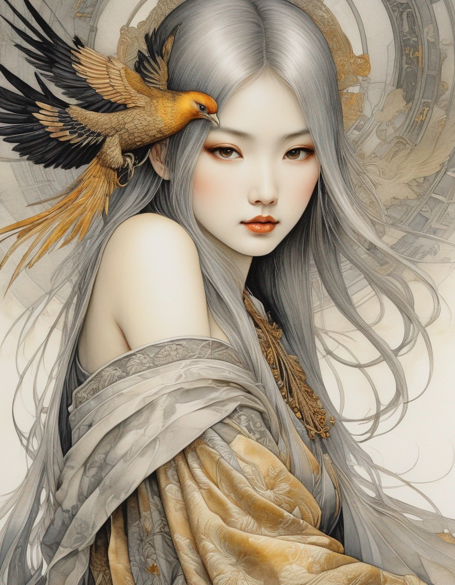 Legend of the Girl and the Phoenix, Medieval Japanese Artists Sumi-e Style, Velvet Black, Shabby, Dull Gold, Amber Gray, Golden Ratio, Surreal Fantasy, Elegant, High Definition Ultra Fine 3D Line, Zenangle Style, Watercolor Patchwork , Arthur Rackham Style, Paul Kidby, Gediminas Prankevicius, Jacek Jerka, Extremely Detailed, Intricate, Thoughtful, HDR, Fractal, Beautiful, Award Winning, Fantasy Look, Fantasy, Crisp Quality