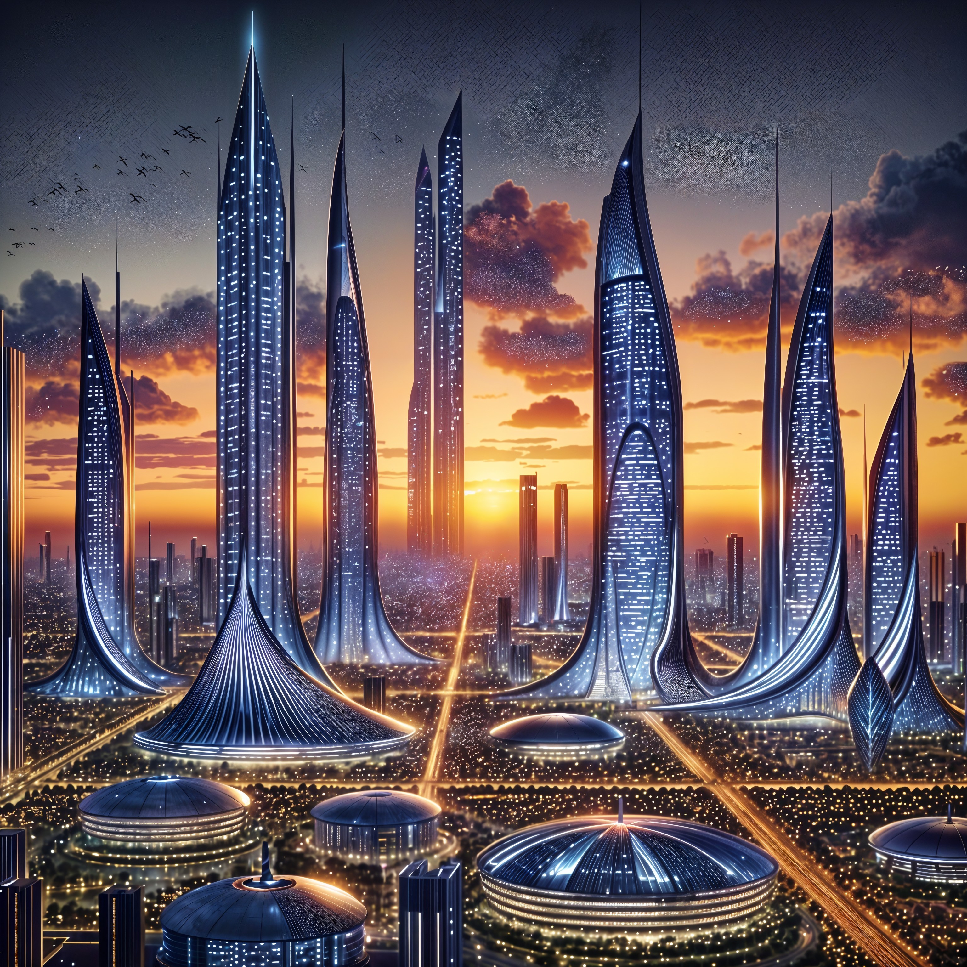 A futuristic cityscape features sleek, towering structures with sharp spires against a vibrant sunset. Round, glowing pods are nestled among greenery, creating a striking contrast in this sci-fi setting.