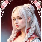 The image features a striking woman with wavy white hair and bold red makeup, adorned with geometric patterns. Clock motifs frame her elegantly styled face, adding a whimsical touch.
