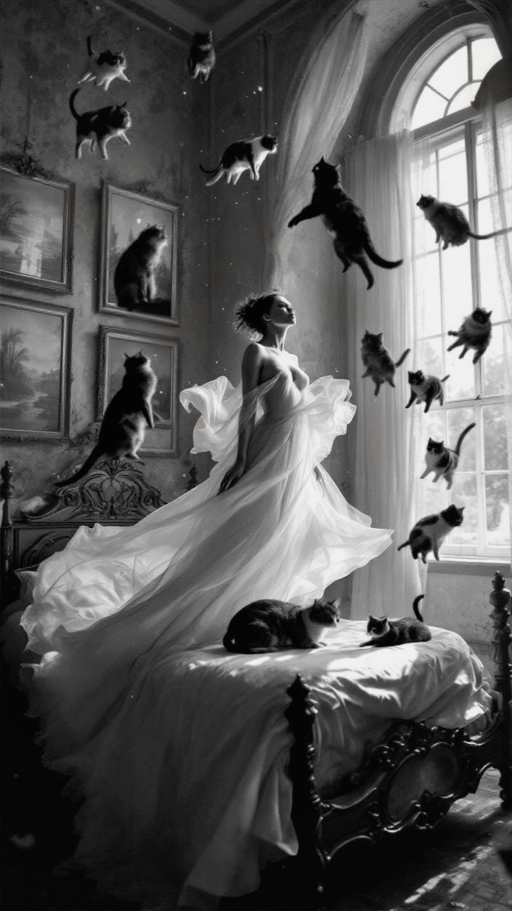 Prompt: A surreal monochrome photograph, ghostly woman with translucent skin, long flowing white dress billowing around her, floating weightlessly above an antique, ornate bed. A multitude of cats, various breeds and sizes, suspended mid-air around her, some with expressions of surprise, others appearing serene. Interior setting, high-ceilinged room, aged wallpaper peeling subtly, lace curtains gently swaying in a non-existent breeze, several framed paintings depicting unsettling landscapes hanging askew on the walls. Low angle perspective, distorted sense of scale, diffused daylight filtering through a tall, arched window creating soft shadows and highlighting dust motes dancing in the air. The composition evokes a dreamlike and fantastical atmosphere, the meticulously rendered black and white tones enhancing the ethereal and unsettling mood, high dynamic range capturing every subtle gradation of light and shadow, sharp, hyper-realistic focus, film grain texture, reminiscent of early 20th-century photography, stark contrast, surrealism, ghostlike presence.