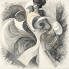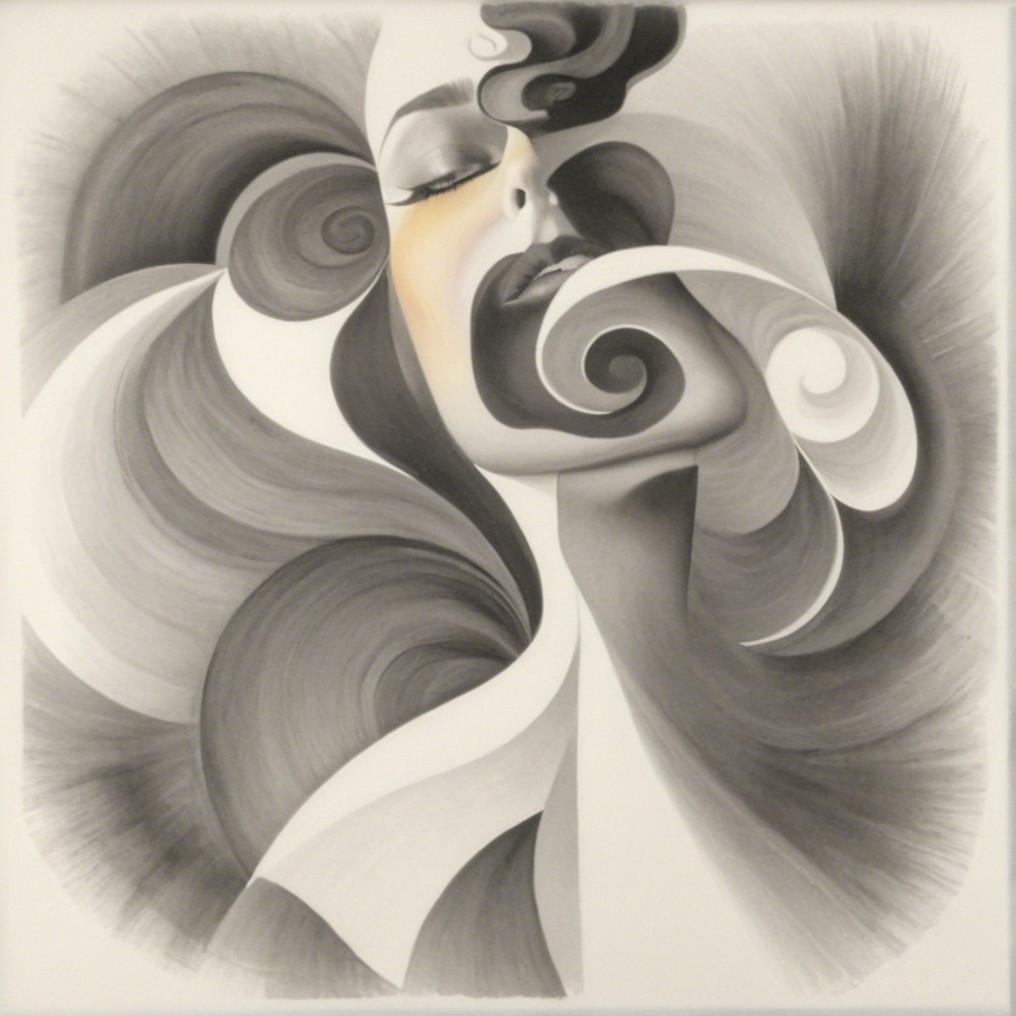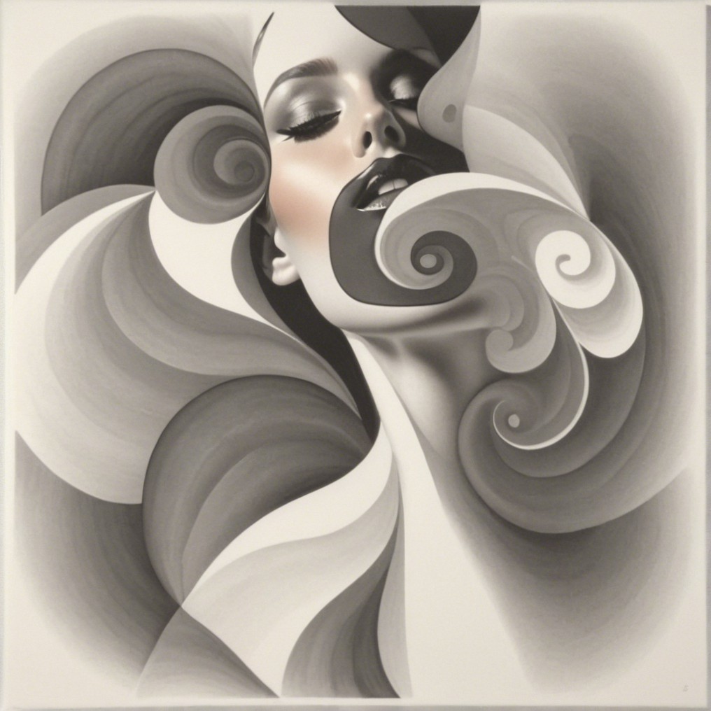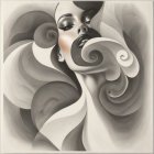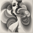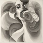 The image features an abstract, monochromatic portrait of a woman with flowing hair. Swirling shapes create a dynamic composition, emphasizing her striking features and bold expression.