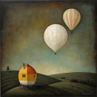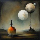 A serene figure in a flowing red dress sits on water, gazing at two large, ethereal moons. Their dreamy reflections merge with a misty landscape, evoking a sense of mystery and tranquility.