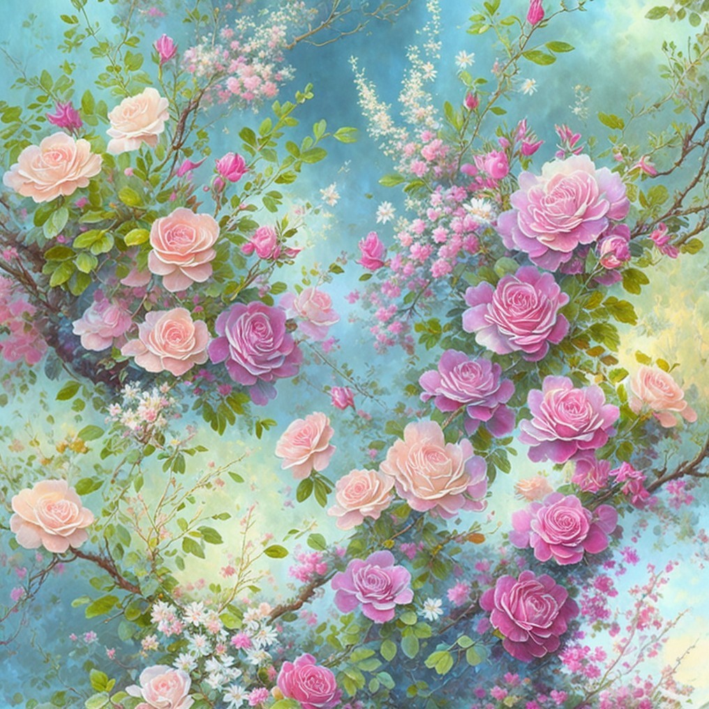 + Prompt:Abandoned exceedingly beautiful old open bible with two even sides, guilted Bible pages in a thicket of brightly, multicolored ombré roses, deep pink bleeding heart flowers, peach roses, baby’s breath, daisies, flowers, vines and roots, by Jean-Baptiste Monge, wet on wet watercolor and ink, intricate details, fantasy, beautiful, award winning, colorful, fantastic view, crisp quality, bookmark made from pearls, leather cover, peach to yellow multicolored roses