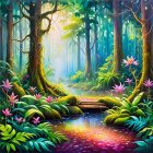 A vibrant, enchanting forest scene with lush greenery, vibrant flowers, and a shimmering stream. Soft light filters through trees, creating a magical atmosphere filled with color and serenity.