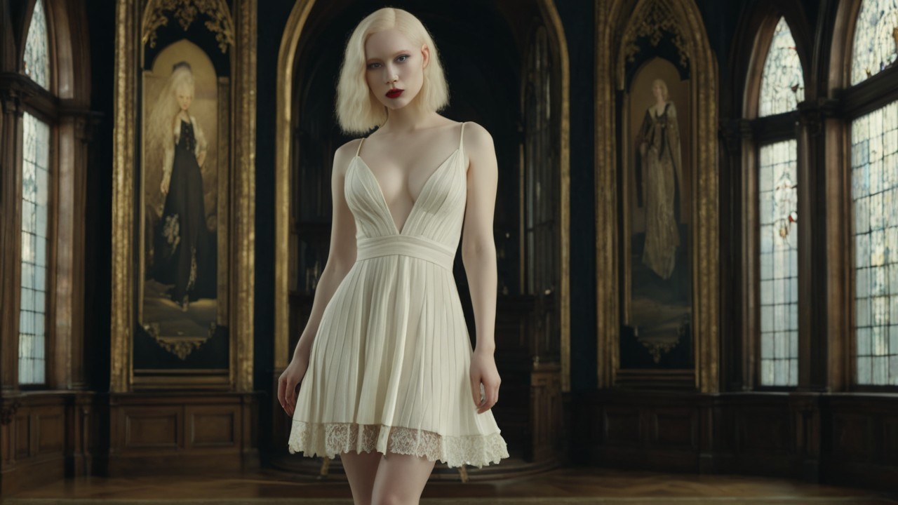 (Try from Rukoed) - A young woman in a delicate white dress stands gracefully inside a grand room with tall windows and ornate artwork, exuding a serene yet captivating presence.