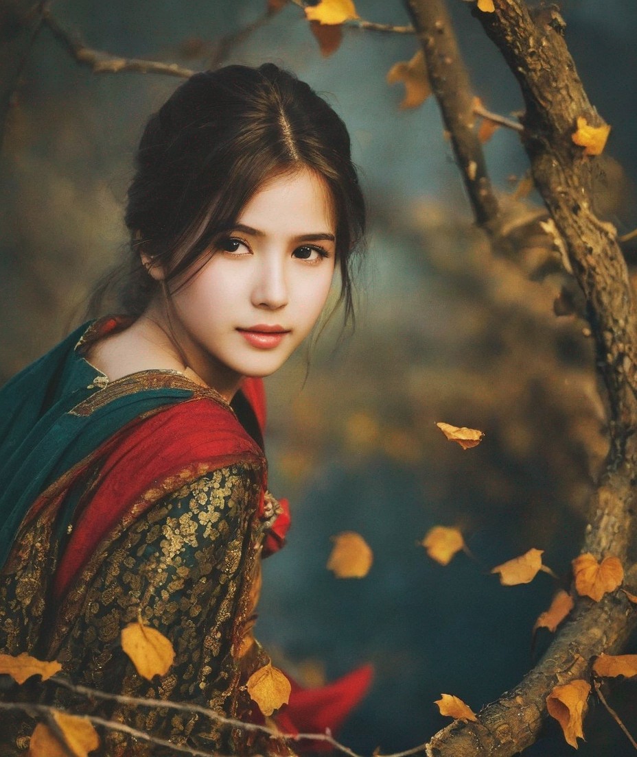 An ethereal portrait of a woman with flowers, delicate jewelry, and a swirling misty background creating a mystical atmosphere.