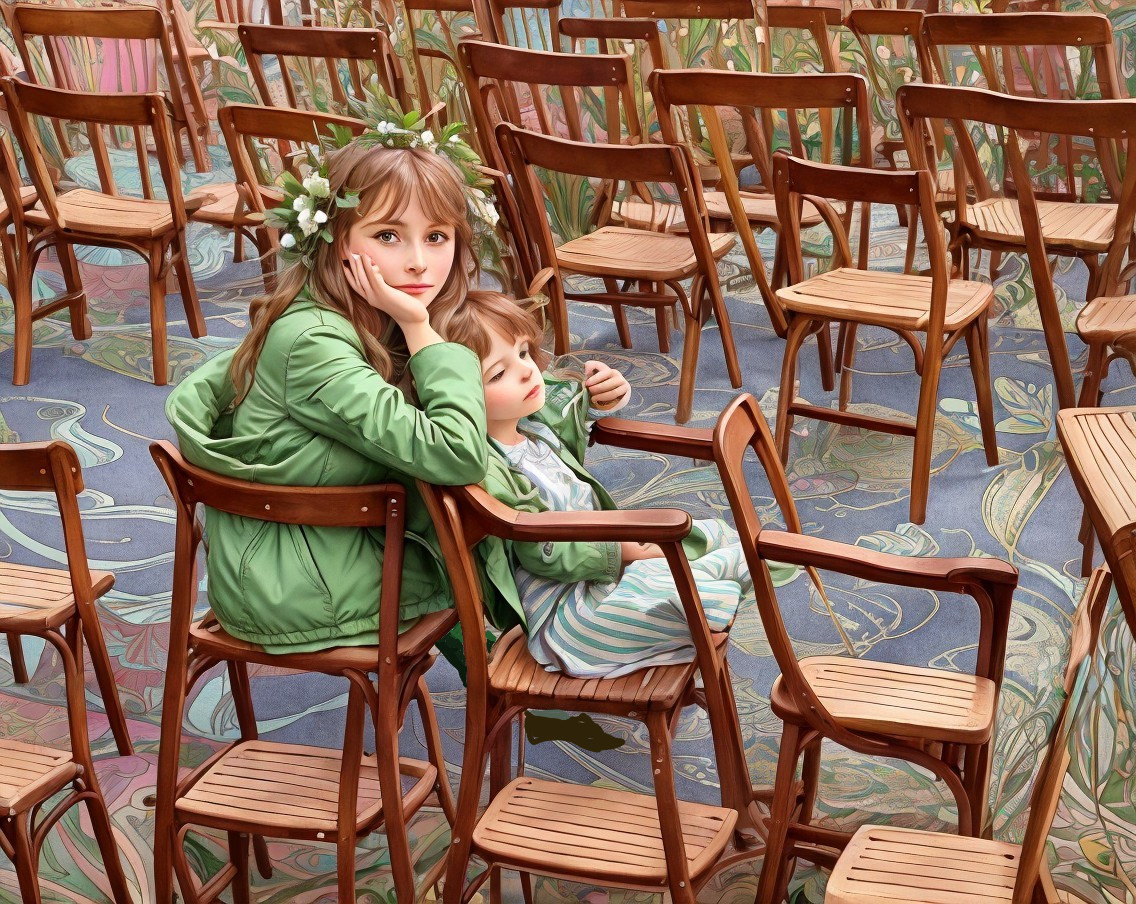 Prompt: Dreaming relaxed woman wearing green jacket and brown shoes, with flowers and a child on the chair next to her between thousands of wooden chairs, decorated floor